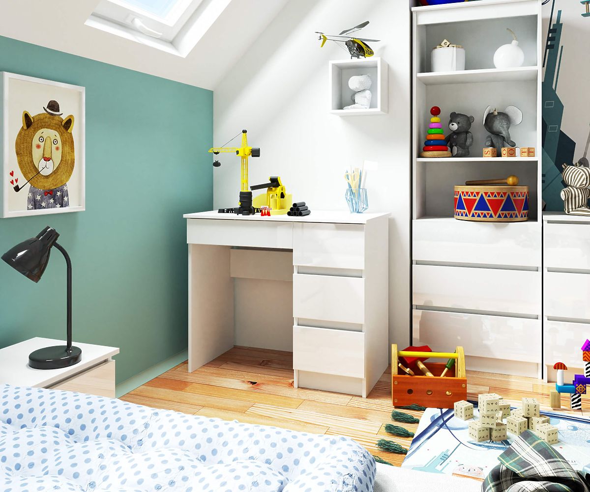 The white body combined with white glossy fronts creates an effect that will surely convince those who prefer minimalism, Scandinavian, or modern style. The presented offer is characterized by easy use, and the spacious drawers can hold many necessary office supplies. Carefully crafted furniture, such as the computer desk A-7 90 cm right, can be freely combined with other elements of equipment available within the same collection.