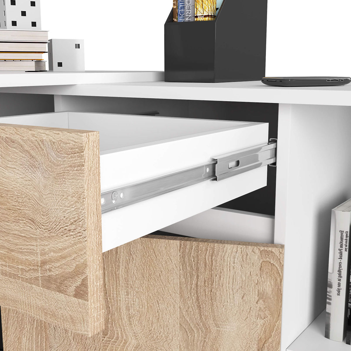 The B-17 corner desk is made from abrasion-resistant, laminated furniture board in two colors. The furniture set consists of a simple white desk and a two-tone commode. The furniture body and top are made from white board, while the cabinet doors and drawer front are in sonoma oak color. The workspace is equipped with a long rear panel. Its left leg is made from board, and the right is part of the commode, which is functionally divided into 3 parts. The outer parts are shelves, while the middle part consists of a drawer and a cabinet below it, closed with individual doors. The cabinet contains 2 shelves. Additionally, the desk is equipped with 4 more shelves.