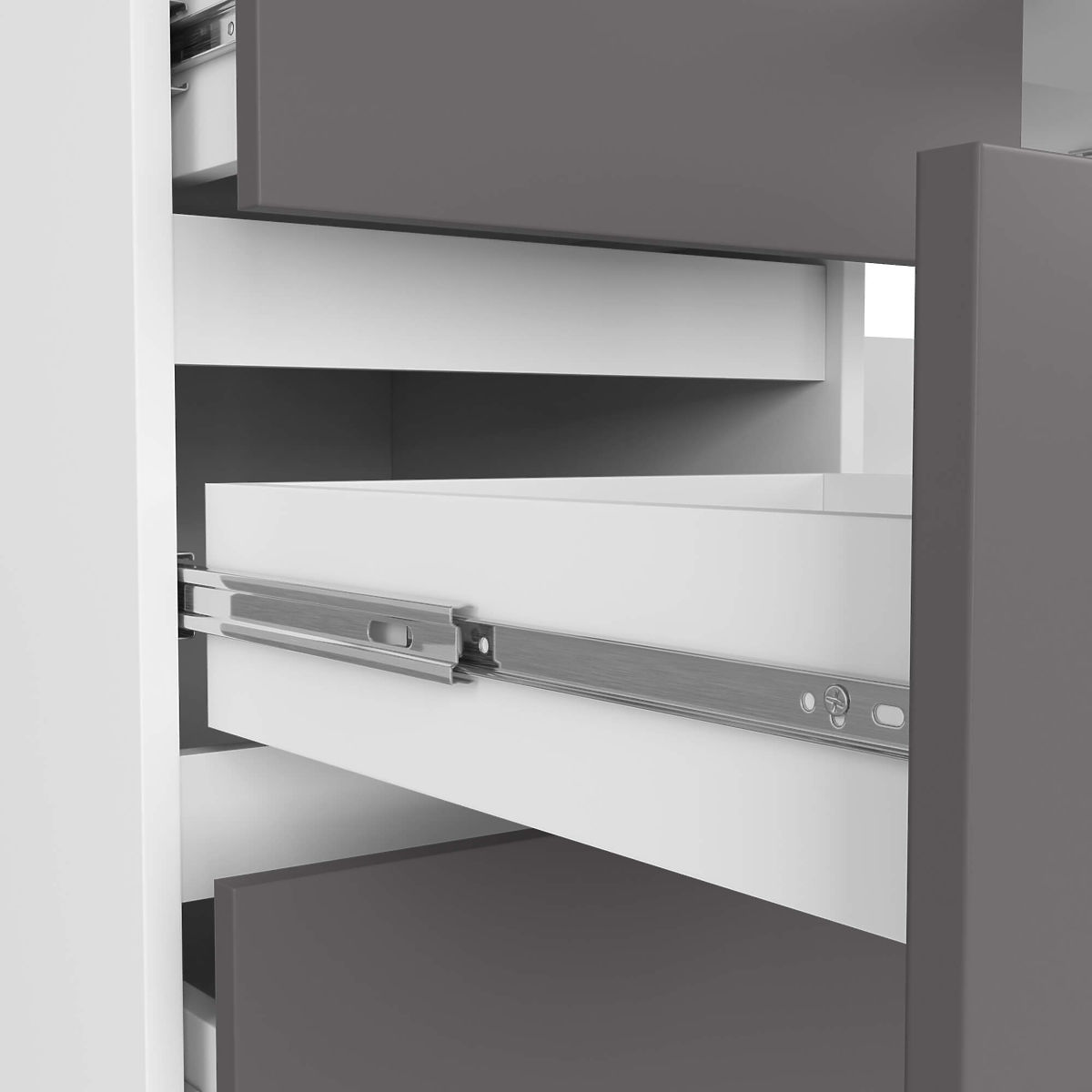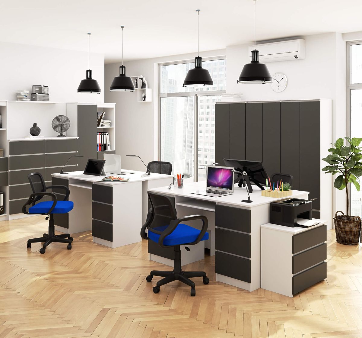 Whether you work in an office or remotely, you spend at least a few hours a day at your desk. You know well that the choice of this furniture significantly affects the comfort of your work. The computer desk A-11 is perfect for this role. It has up to 6 spacious drawers with a depth of 34.5 cm, where you can easily store all documents and equipment. The desk also has a pull-out shelf where you can conveniently place a keyboard or hide the most important notes. The classic combination of white and graphite gray will perfectly match simple, elegant offices.