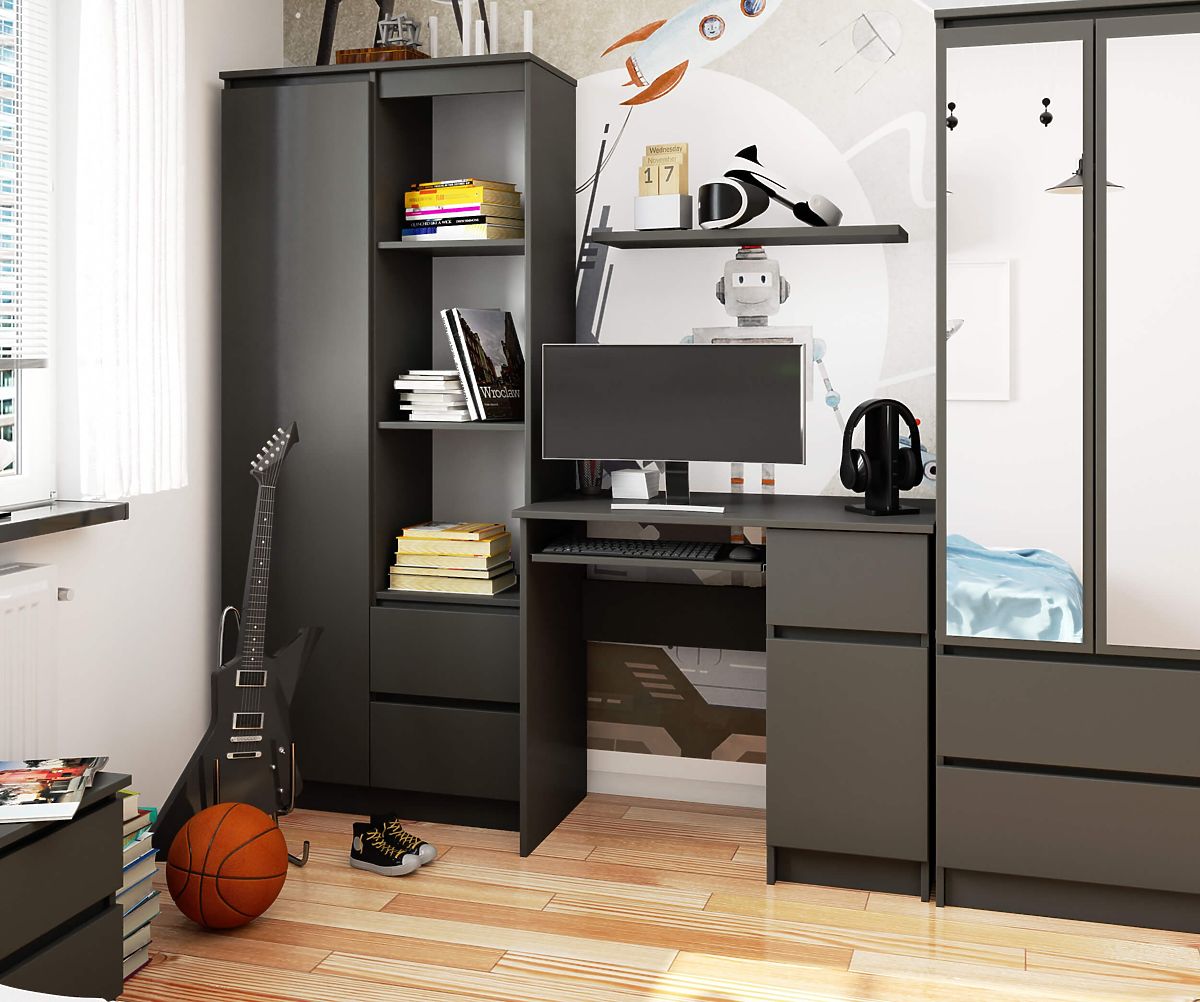 The free-standing PIKSEL 90 cm desk in GRAPHITE GREY is an ideal solution for small interiors. It serves very well as a school or computer desk. Its ergonomic design ensures comfort during use. The desk is equipped with a sliding keyboard shelf, a practical side drawer, and a cabinet with a shelf that easily accommodates binders and books. The desk is made from a pleasant-to-touch, easy-to-maintain matte board covered with a durable laminate layer. The whole is complemented by practical silver-colored handles.