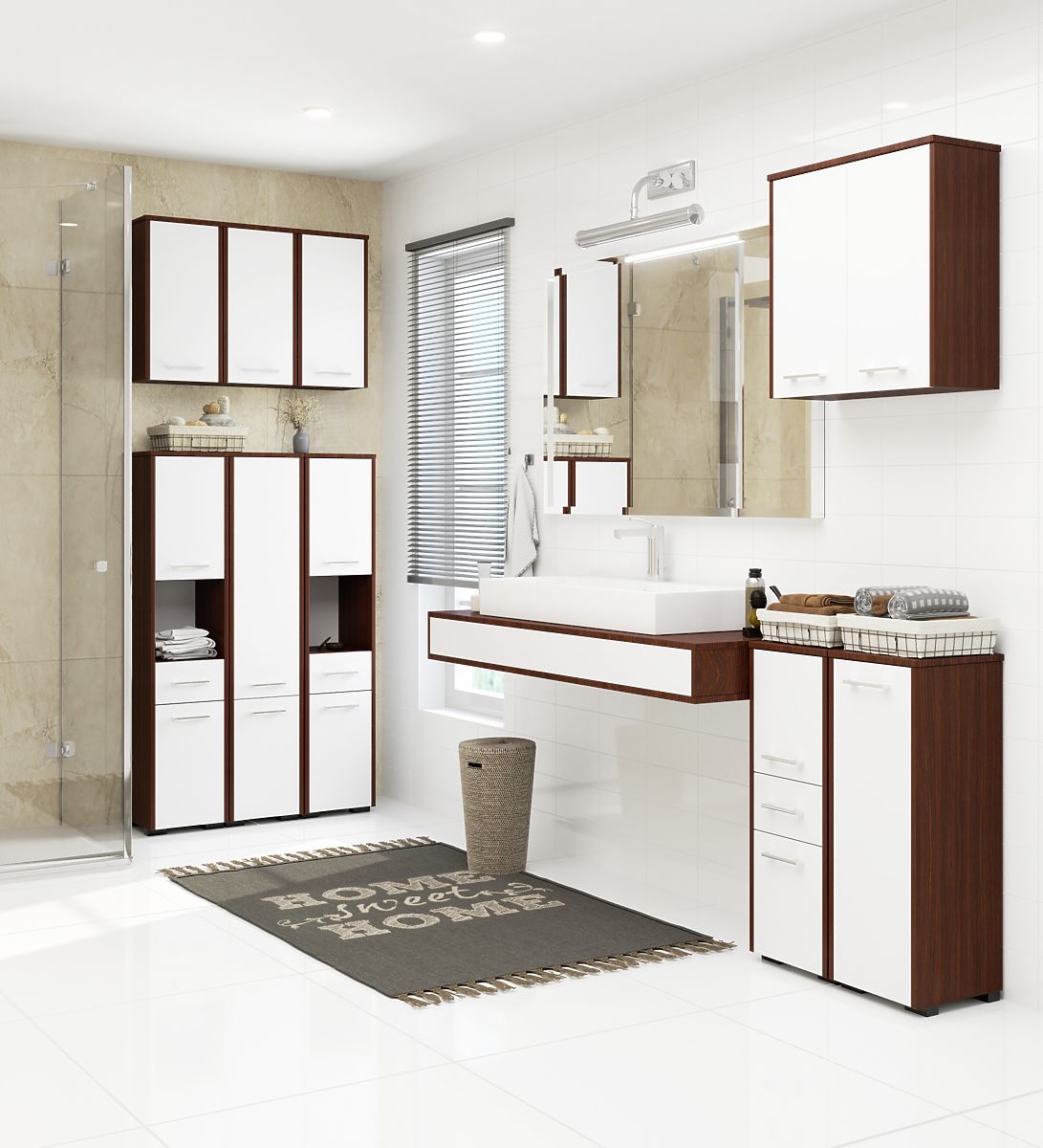 Even in a small bathroom, conditions can be created for convenient storage of cleaning agents or cosmetics. It only requires using suitably designed furniture. The bathroom cabinet over the washing machine is a great solution to utilize often unused space above this appliance. Comprising a cabinet and shelves, this furniture will be an invaluable aid in organizing the bathroom. In the cabinet, we can easily store laundry powders, liquids, and other hygiene products. The shelves can serve as a place for towels or containers with bathroom accessories. The white doors combined with a wenge-colored body is a very sophisticated combination that gives the room a modern style. Moreover, its optimal dimensions and ergonomic shape ensure it fits into any space. This cabinet is made from materials that are perfect for the bathroom. The laminated board is abrasion-resistant – thanks to this, this furniture will maintain its aesthetic appearance for a long time.
