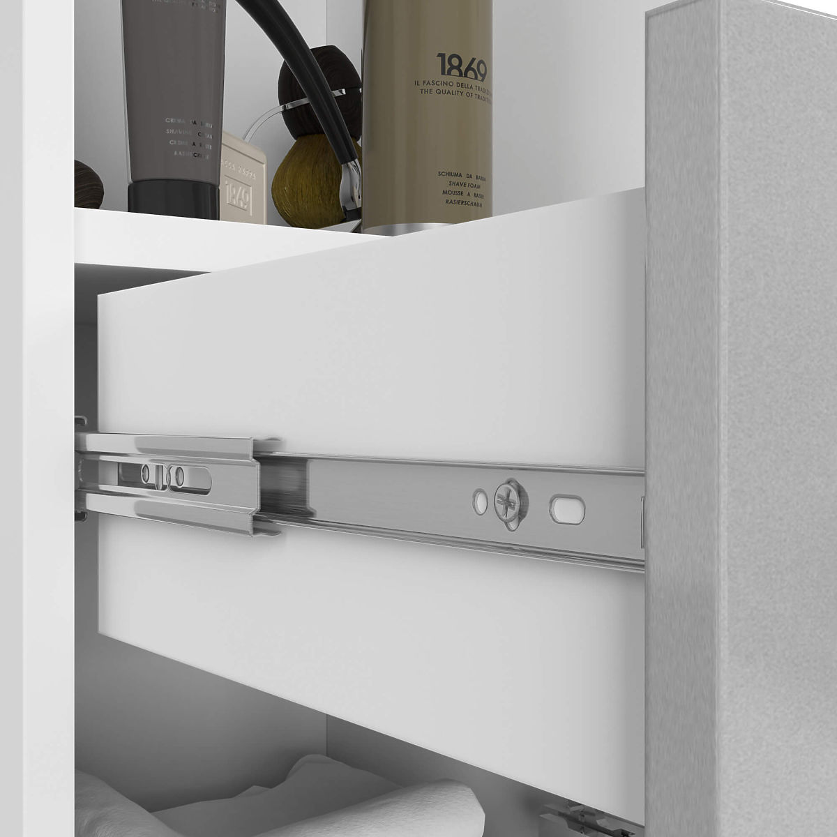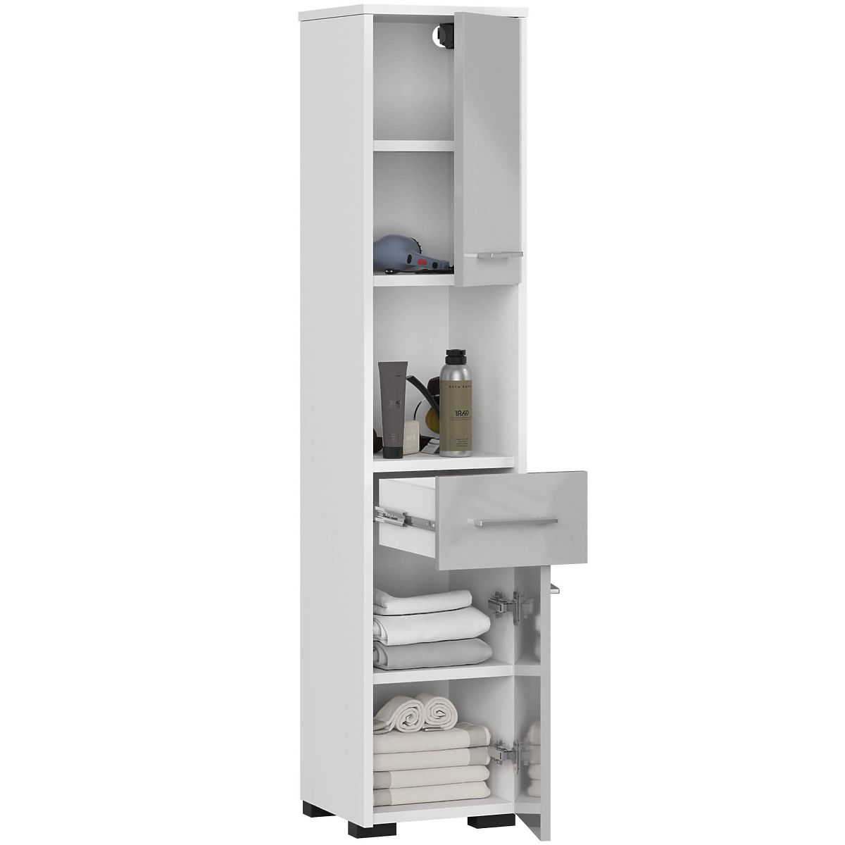 The column has two closable cabinets with one shelf, a drawer, and a niche above it for storing essential cosmetics. Both cabinets and the drawer have silver handles that perfectly match the white, glossy laminate of the front sides.