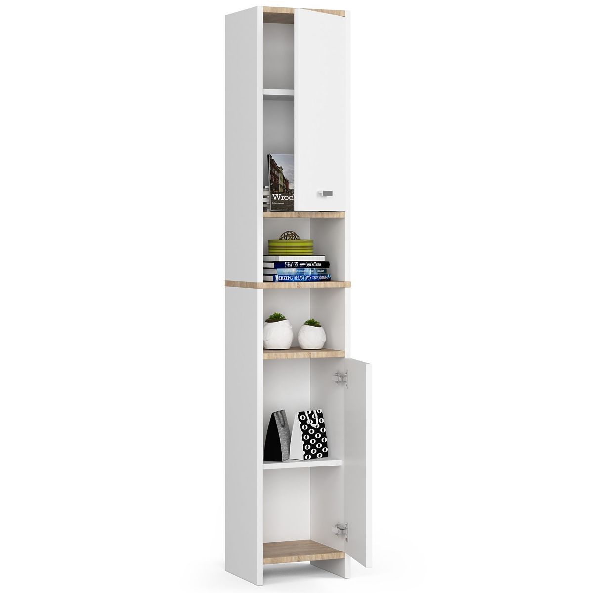 White bathroom shelf with 4 shelves and 2 doors. .. more