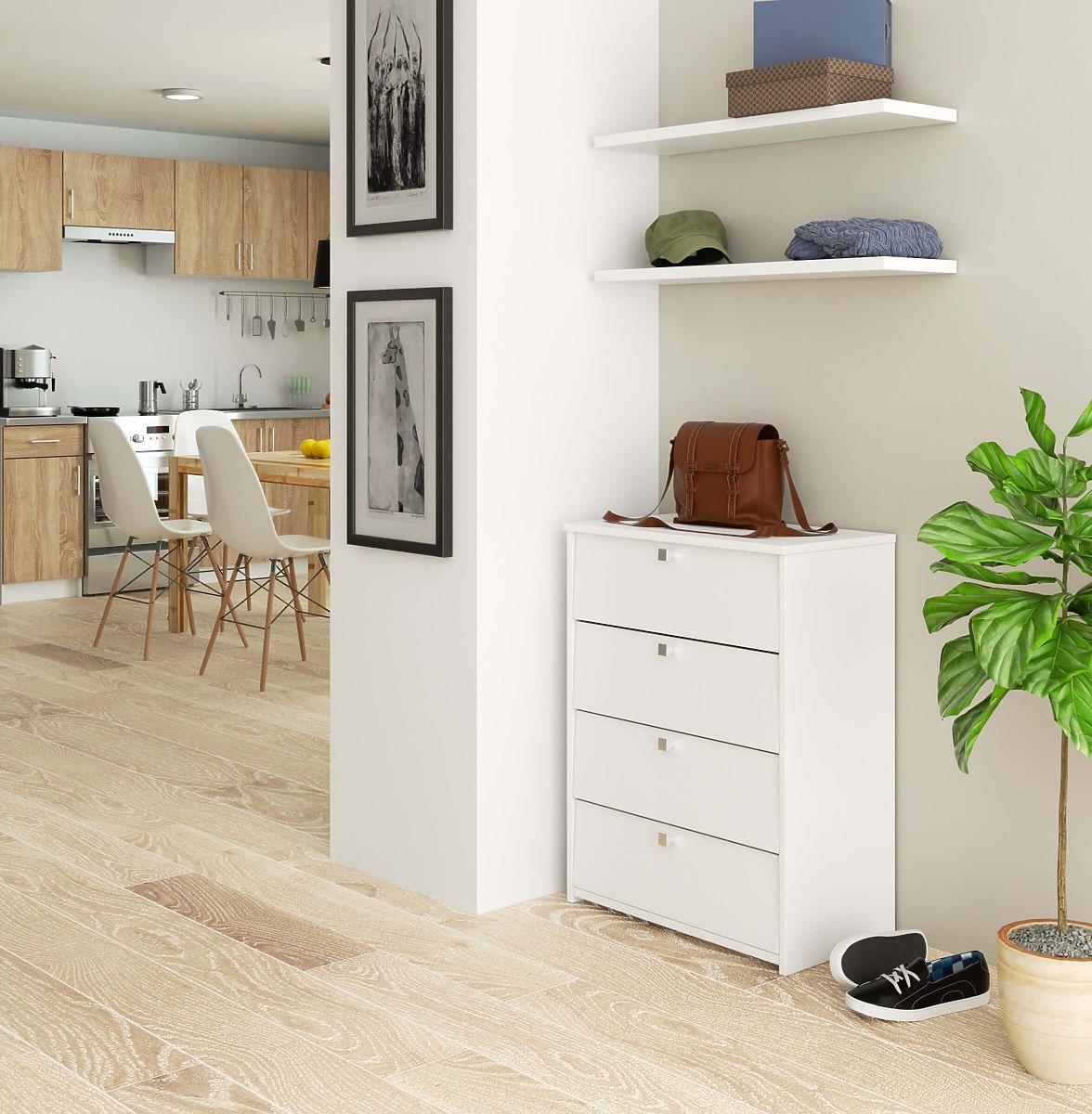 White shoe cabinet with 4 flip doors and Scandinavian design. .. more