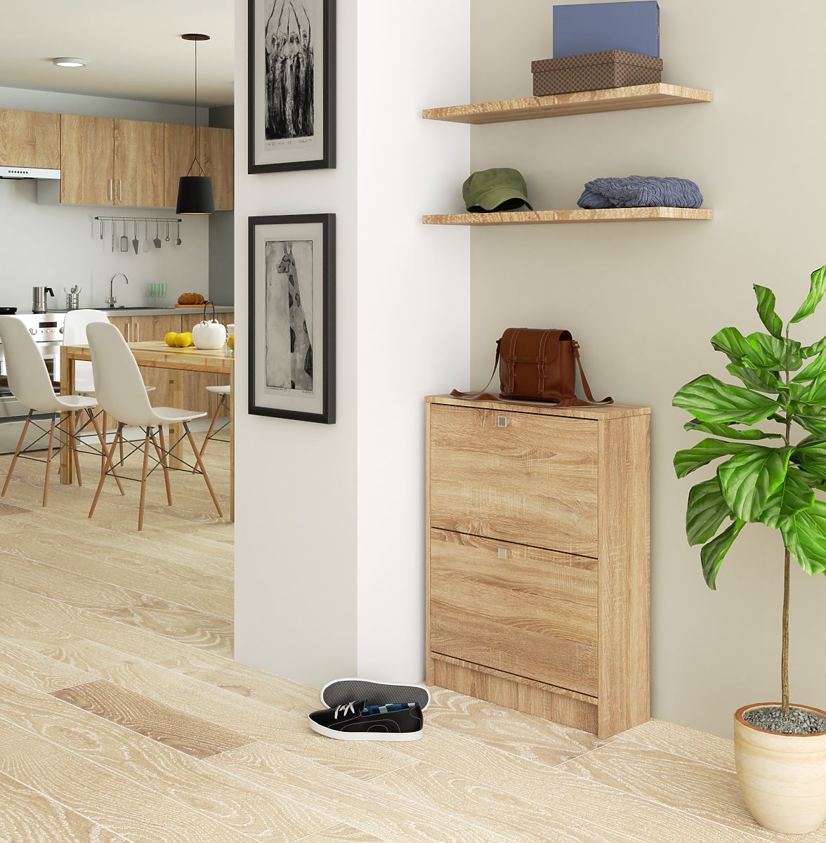 Flip-out shoe cabinet with oak Sonoma finish, holds 6 pairs of shoes. .. more
