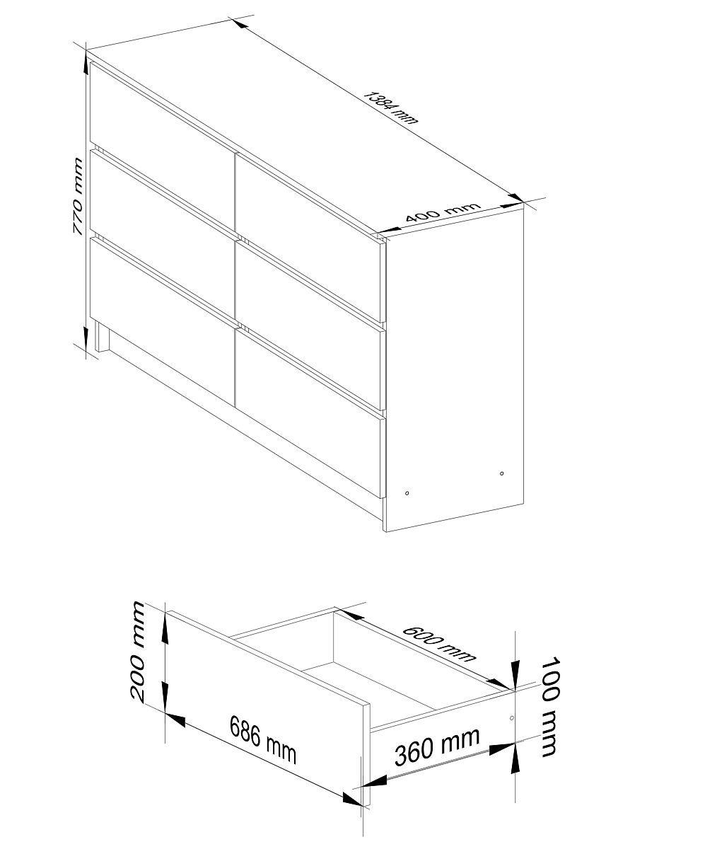 DRESSER K140 6 DRAWERS Made from 16mm abrasion-resistant laminated board.