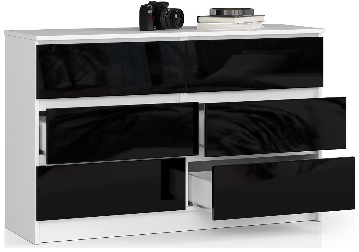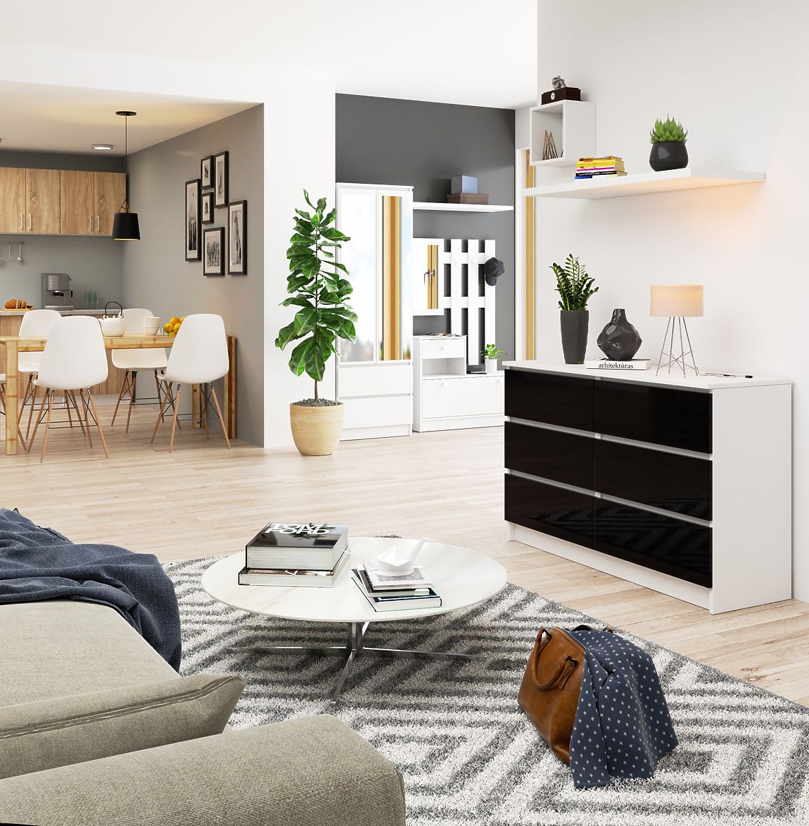 The chest of drawers, model K 120 cm, attracts attention at first glance. The timeless elegant black high gloss combined with white fronts creates a very effective stylistic whole. Such a combination looks exceptionally elegant and stylish. The furniture proves that classic white and black never go out of fashion.