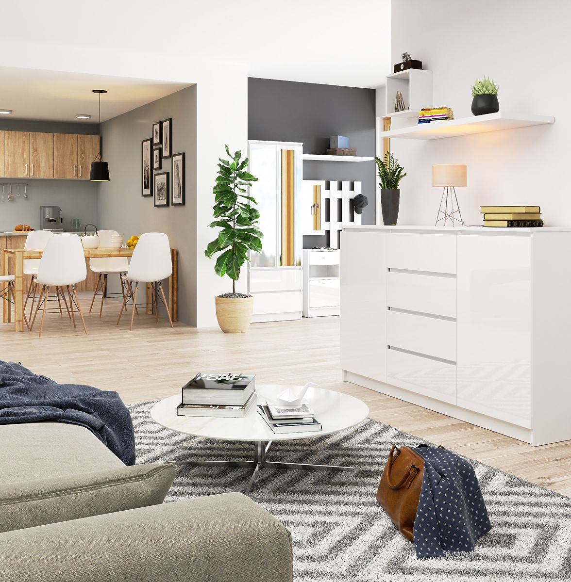 Depth - 40cm- The body of the sideboard is made of 16mm white semi-matte laminated board resistant to abrasion- The fronts are made of 19mm ACRYLIC board in white high gloss finish