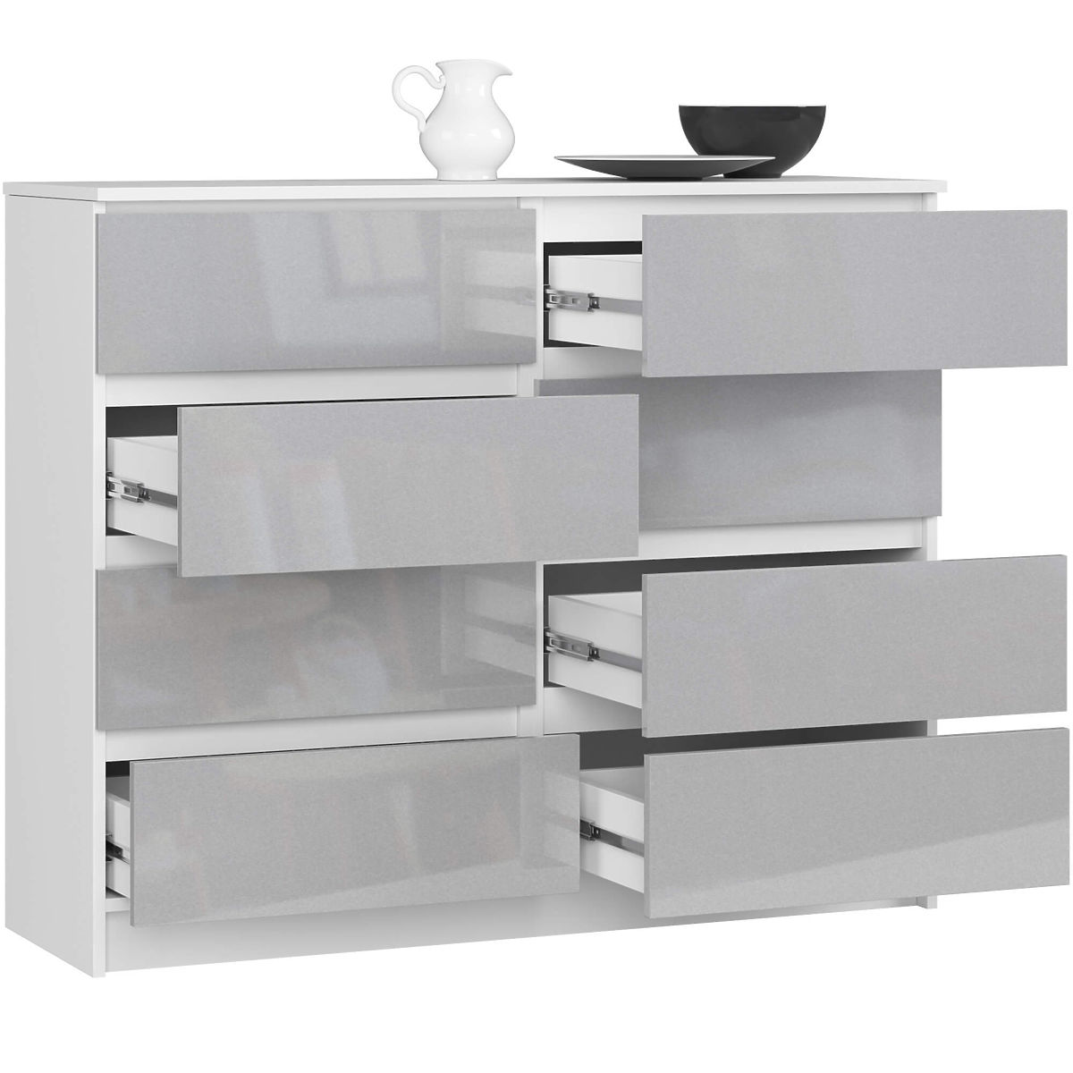 We offer a large sideboard with 8 drawers. The sideboard features a white semi-matte body made from 16 mm thick laminated board, which is highly resistant to abrasion. The fronts are made from MDF board with an acrylic coating, 19 mm thick, known for its high durability and resistance to fading from intense sunlight. The edges are equipped with ABS edging, providing high protection against mechanical damage and abrasion. The handleless drawers have a modern metallic color with a high gloss finish. The drawers are guided on metal ball-bearing slides. The sideboard has a simple yet very versatile appearance. It fits perfectly into any interior, looking equally good in the living room, bedroom, or even an office. Thanks to the very spacious and voluminous drawers, it ensures order in every room. Additional furniture from the CLP series can be successfully matched to this model of the sideboard.