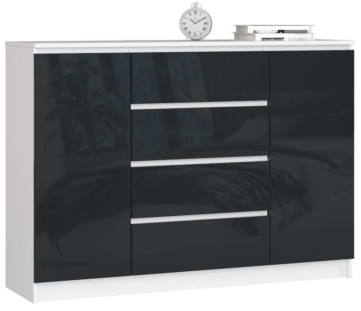 The two-tone sideboard K 140 with 2 cabinets and 4 drawers is made from MDF board with an acrylic surface (manufacturer Kronospan). The furniture body is in white, while the fronts of the cabinets and drawers are in a contrasting high gloss graphite color. The sideboard is symmetrically designed. Its central part consists of a row of 4 drawers, while the left and right sides are cabinets with individual doors opening outward. The drawers slide out thanks to metal roller guides and provide convenient storage spaces due to their large capacity. Each cabinet of the sideboard is equipped with 2 shelves.