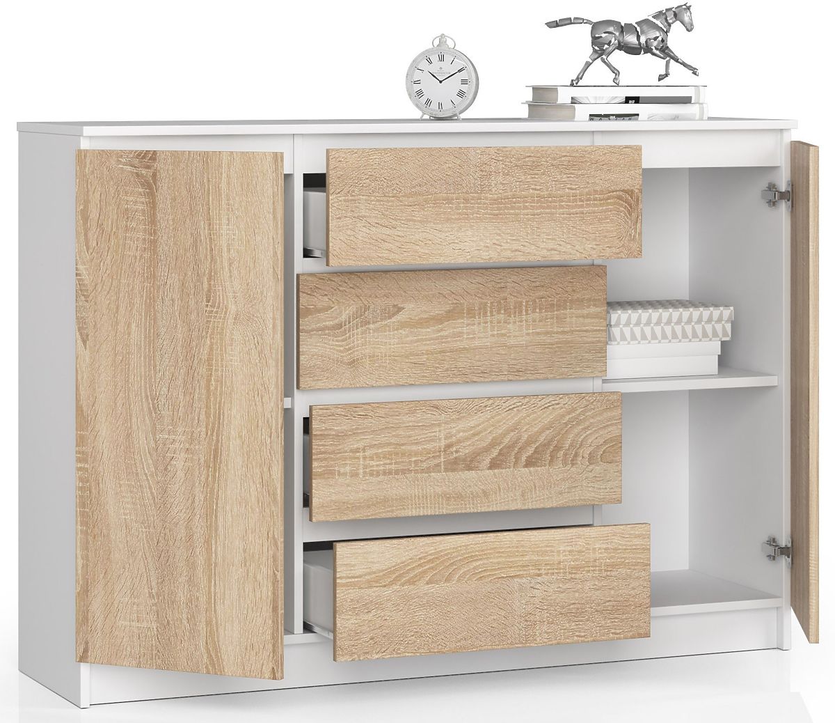 The K 140 sideboard with 4 drawers is made from durable Kronospan laminated board. The body of the K 140 is white, while the fronts of the cabinets and drawers are in sonoma oak color. The central part of the sideboard consists of a series of 4 drawers placed one above the other, while individual doors are designed on both sides of the sideboard. The drawers slide in and out thanks to metal roller guides, providing ample storage space. Upon opening the doors, the user can utilize two cabinets equipped with two shelves each.