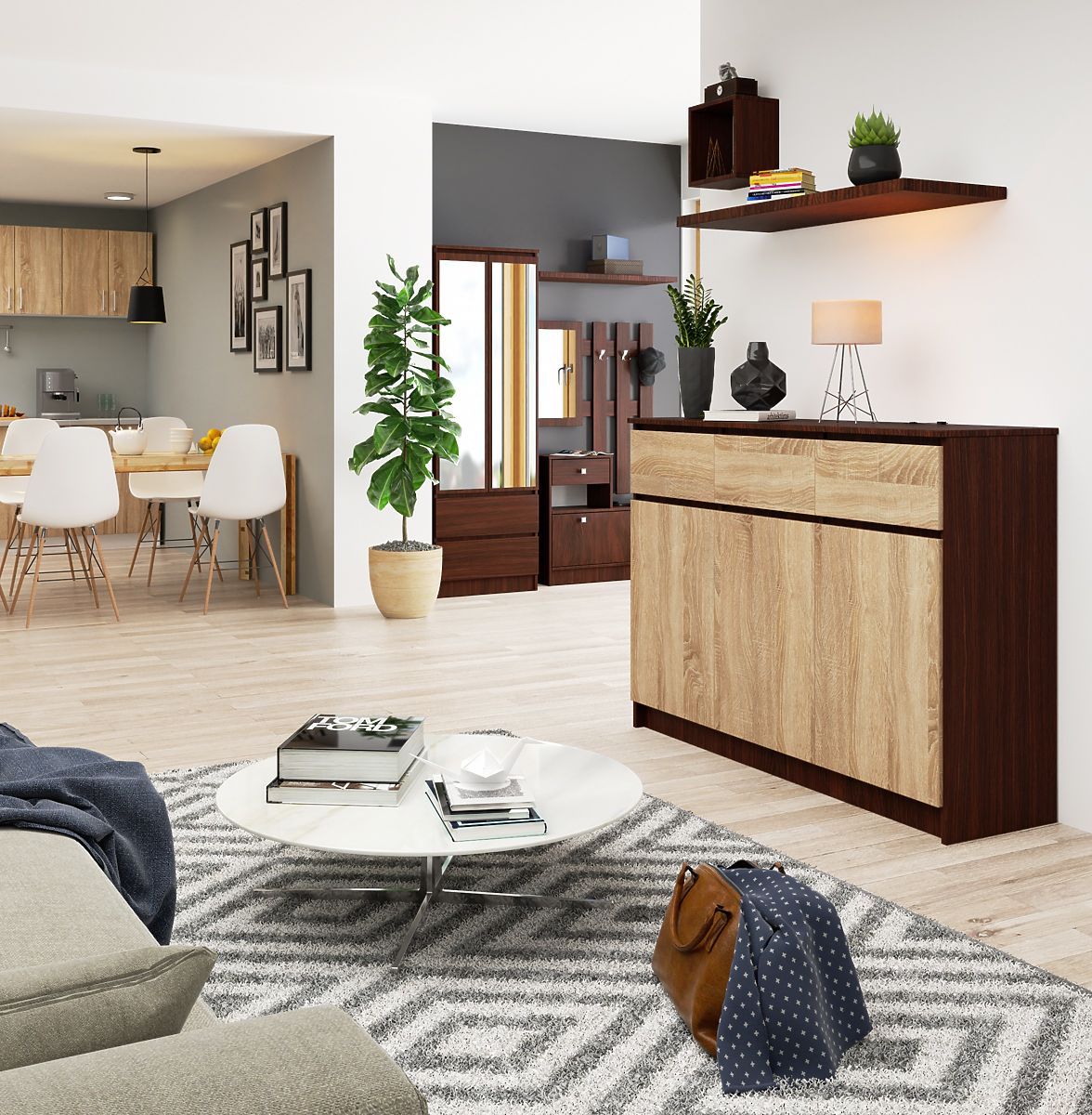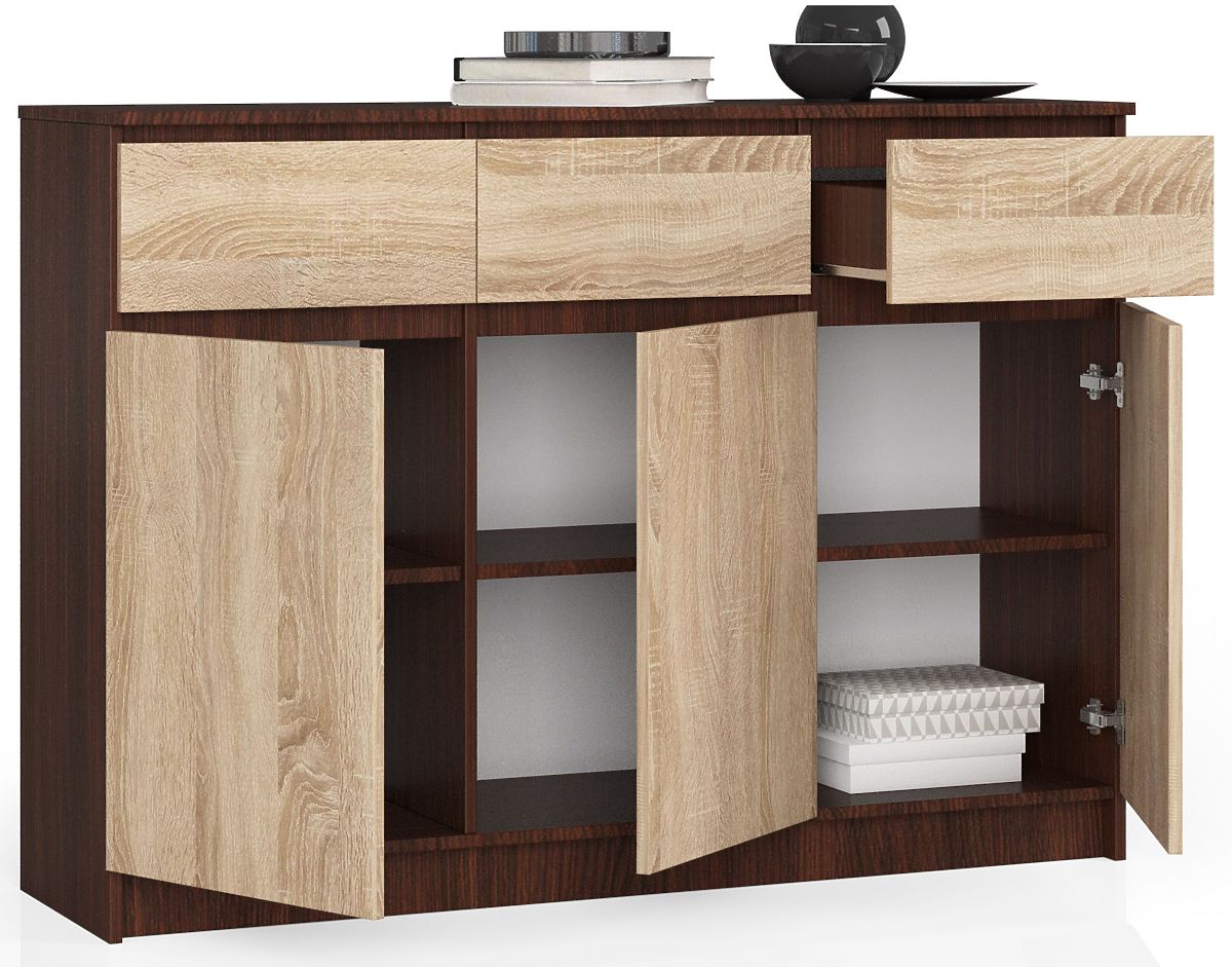 The K 140 sideboard is crafted from durable Kronospan laminated furniture board in two finishes. The frame of the furniture is a wenge wood imitation, while the drawer and door fronts are in a lighter shade of sonoma oak. The furniture is visually divided vertically into 3 equal parts. Under the top of the sideboard, there are 3 separate drawers placed parallel to each other. Below each drawer, there are cabinet doors. Upon opening them, 3 separate cabinets are visible inside the sideboard, each equipped with 2 shelves of the same size. The drawers slide out thanks to metal roller guides.