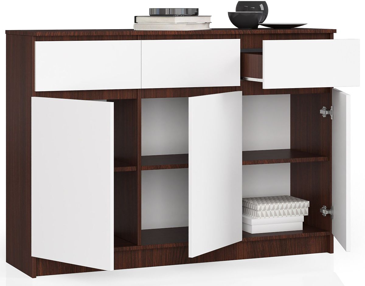 A large and stylish sideboard in dark wenge color with classic, smooth, and white fronts of cabinets and drawers. Made from durable 16 mm thick laminated board. The edges of the cabinet are covered with a strong ABS edge, which is more resistant to scratches and mechanical damage. Equipped with three functional and spacious drawers and three very spacious cabinets, each with an additional shelf inside. The drawers move on durable metal runners and can be easily removed and thoroughly cleaned inside if necessary. Handle-free fronts are the most modern and fashionable solution, enjoying great popularity. The sideboard easily accommodates all clothing and other household needs, offering plenty of storage space and is comfortable to use. The simple design and minimalist style make this furniture universal, perfectly fitting into any interior. It fits into classic, elegant, and modern styles. The sideboard will look equally good in the living room, bedroom, or even in the hallway. Additionally, this model of the sideboard can be combined with other furniture in the same color scheme, allowing for the creation of an individual, coordinated set. Thanks to the large and spacious sideboard, order will prevail in every home, and storage space will not be lacking.