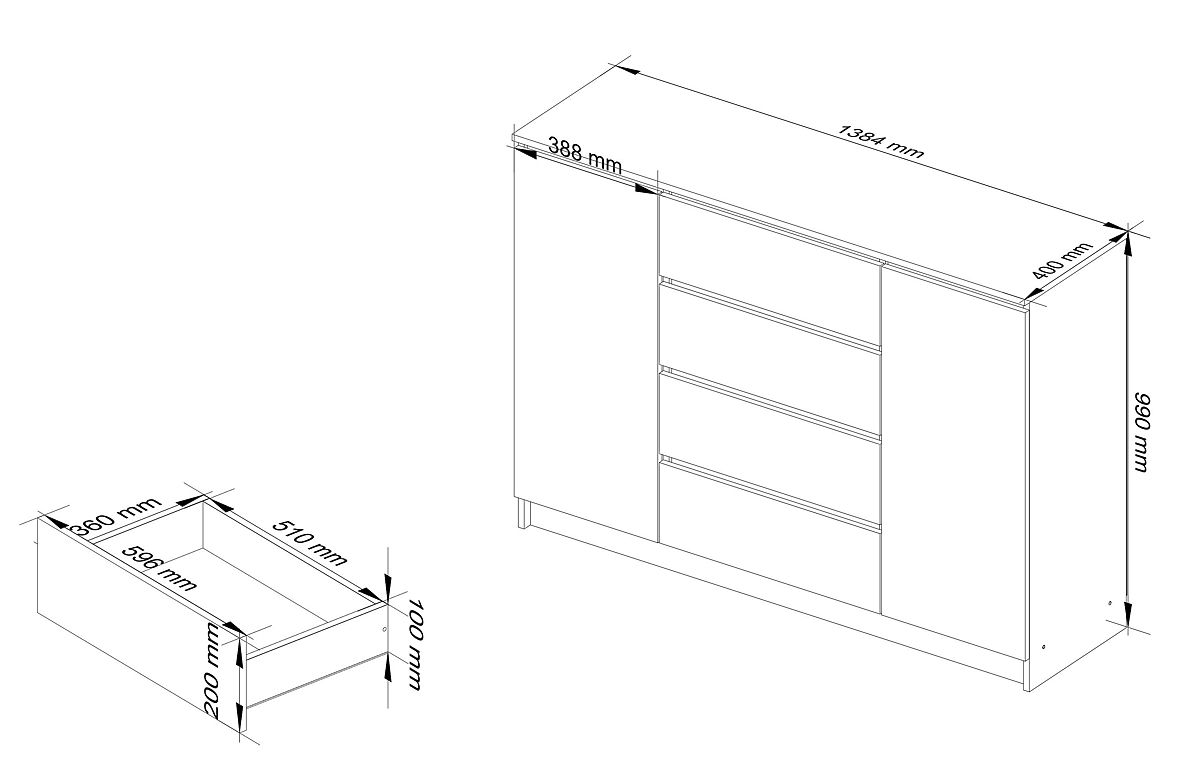 The K140 sideboard with 2 doors and 4 drawers is made from high-quality 16 mm abrasion-resistant laminated board, manufactured by Kronospan. The edges of the furniture are sealed with ABS edging to protect against any damage. Attention to every detail ensures that the sideboard perfectly fulfills its functional purposes while adding elegance to the room.