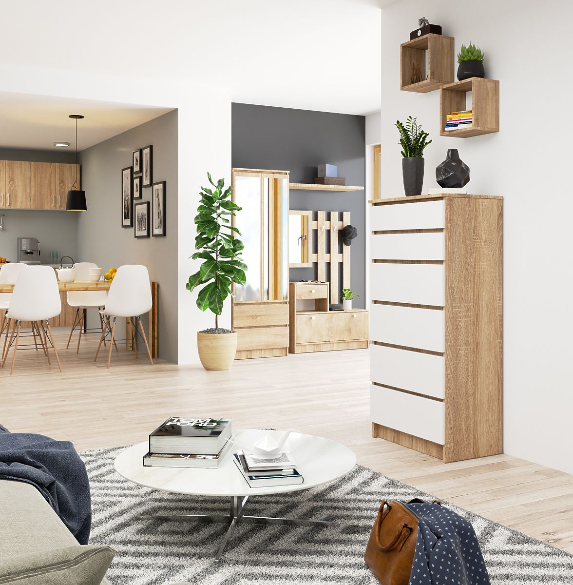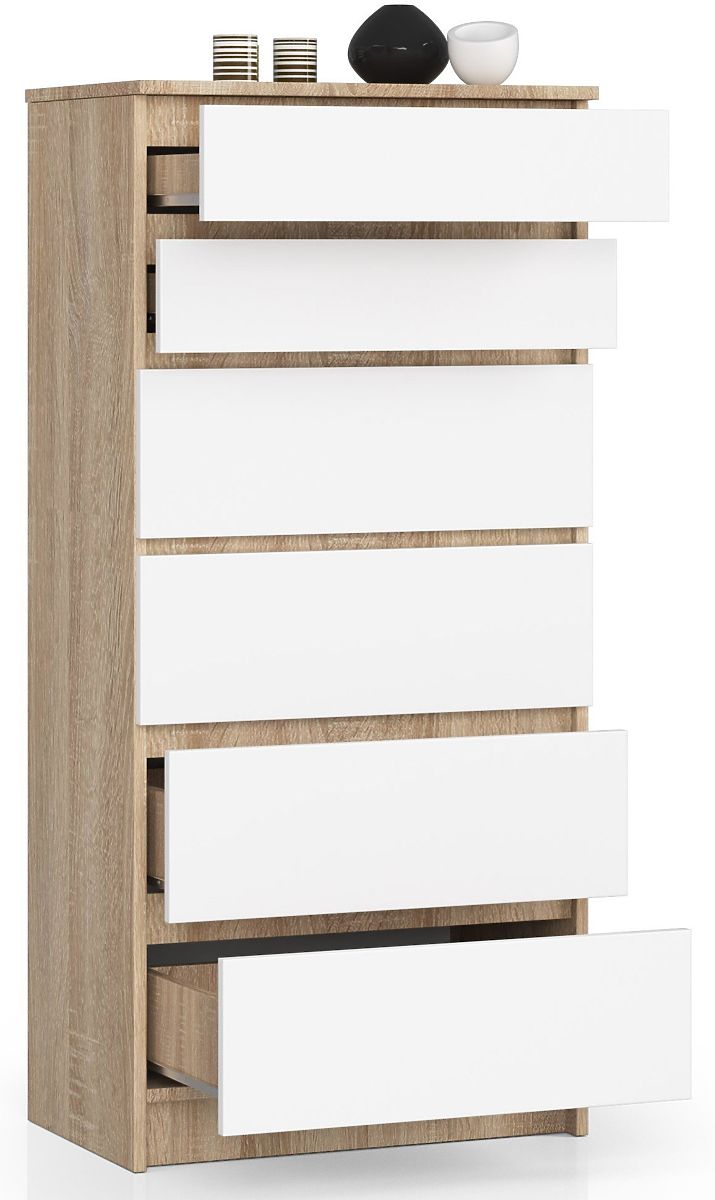6 spacious drawers, stable construction, and timeless appearance - this is the K60 chest of drawers! It stands out with an attractive combination of a body in elegant oak sonoma color and drawers with universal white fronts. Its simple yet effective design will look great not only in the bedroom, hallway, study, or living room - it is also easily combinable with other interior elements of the given room. In the range of our Akord furniture online store, you will find furniture from the same collection that matches the K60 chest of drawers.
