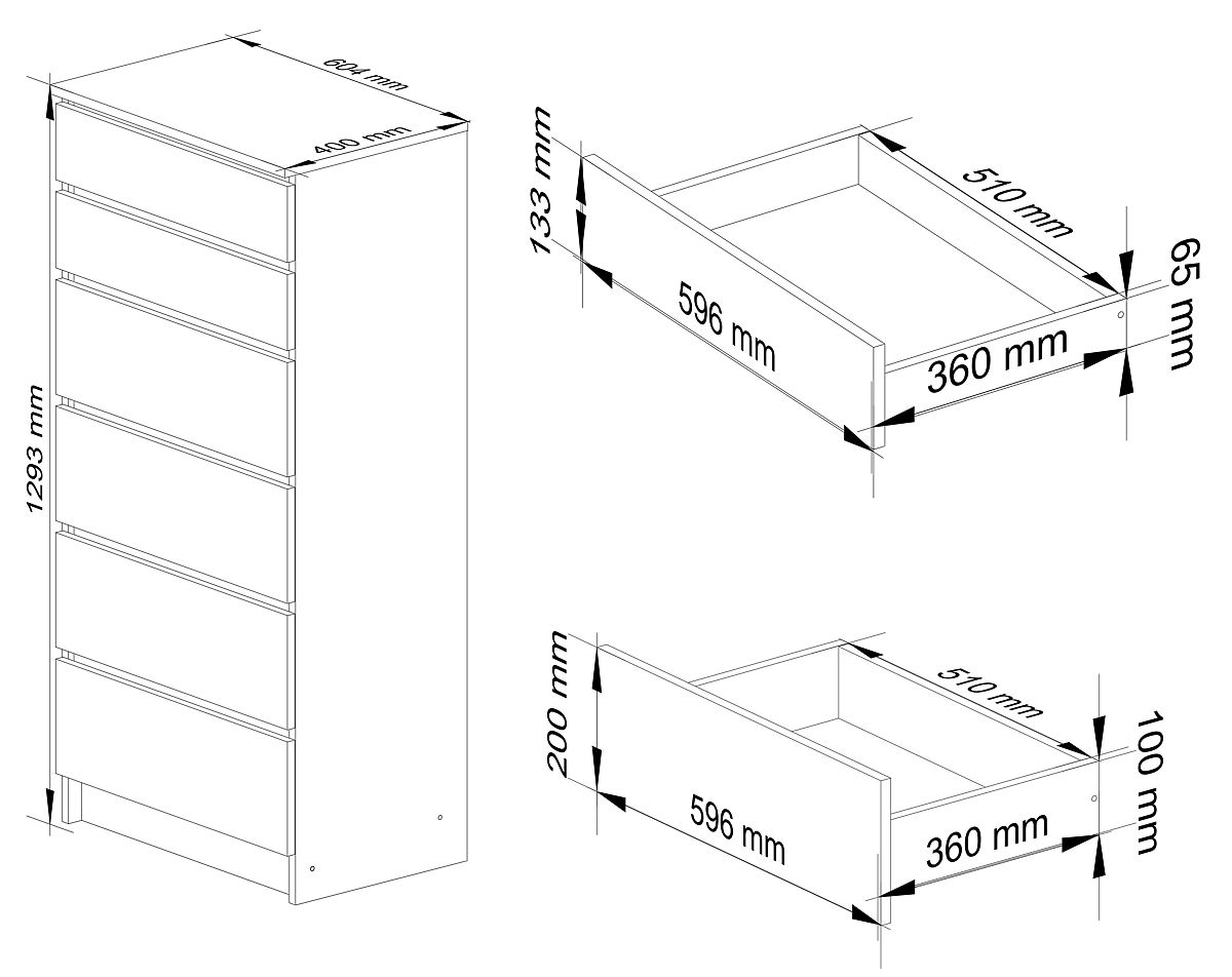 The drawers of the K60 chest of drawers move on metal roller guides. This ensures quiet and smooth operation for many years! The K60 chest of drawers itself is made from laminated board - it is 16mm thick and abrasion-resistant. Its visible edges are finished with durable ABS edging. Thanks to this solution, our furniture is easy to keep clean and exceptionally resistant to various mechanical damages that may result from everyday use.