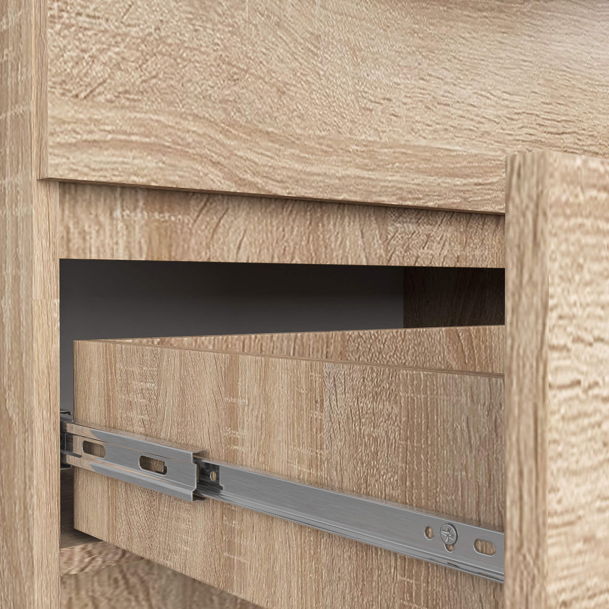 - Drawers move on metal ball-bearing slides