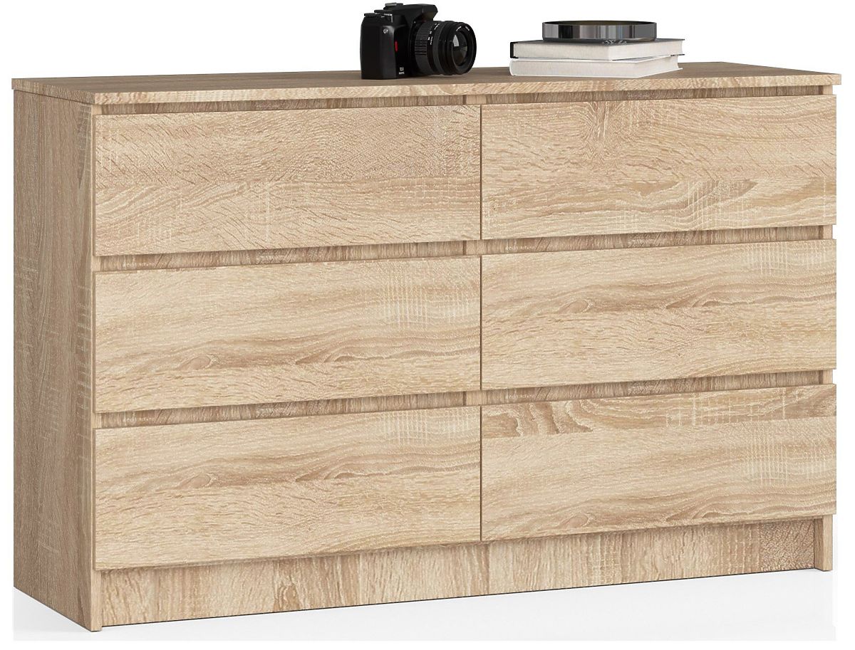 If you are looking for an exceptionally spacious yet elegant piece of furniture, the K120 chest of drawers from our range is an excellent solution! Made from high-quality laminated board and equipped with up to 6 drawers, this chest is an ideal choice for the bedroom, living room, hallway, or office. Its elegant appearance is due not only to its tasteful and functional design but also to its fashionable oak sonoma color.