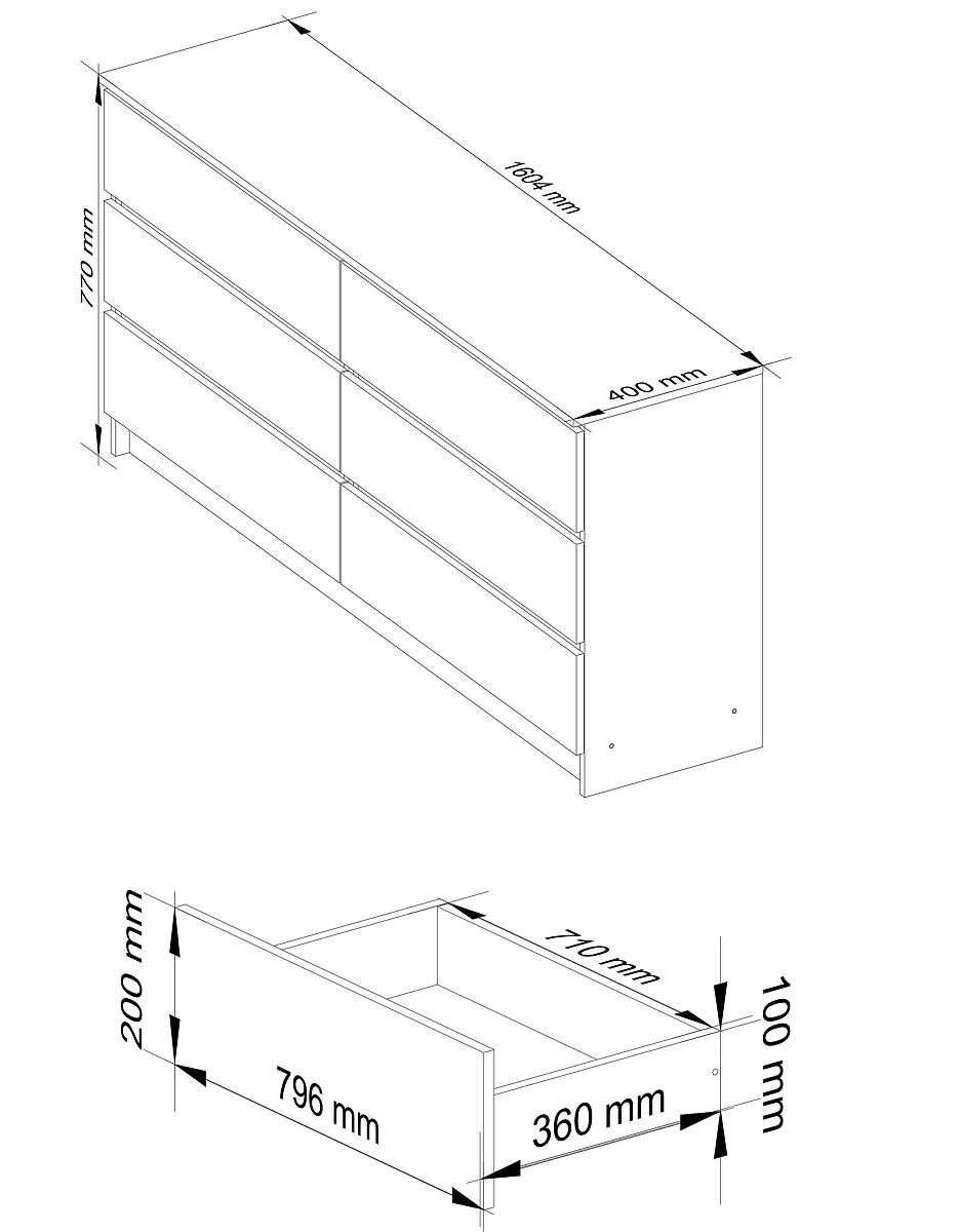 The chest of drawers we offer combines an attractive price with excellent quality. The product has been made with great care and features a sturdy construction. The K160 chest of drawers, 160 centimeters wide, is made from 16-millimeter thick laminated board, showing high resistance to abrasion. The edges are finished with ABS edging. The height of the chest is 77 centimeters and the depth is 40 centimeters.