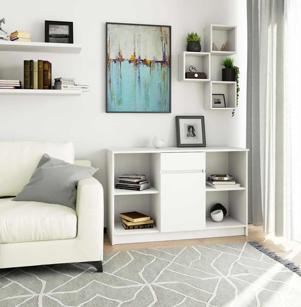 The white sideboard from the B-17 set can serve as an independent element of any room's furnishings. Thanks to its modular design, it can be combined with another segment of the set to create a comfortable corner desk (additional table elements available for purchase in our store). The middle section of the sideboard includes one drawer and a closable door, allowing for free storage. Additionally, it has four separate, symmetrical shelves with plenty of display space. The sideboard, 120 cm in length and 77 cm in height, is made of laminated board. It has been designed to fit most rooms. It can be an interesting element of a living room interior, serve as functional storage furniture in a bedroom, and is also suitable as an additional kitchen segment. Thanks to its neutral white color and minimalist design, it becomes an attractive and above all functional addition to any interior.