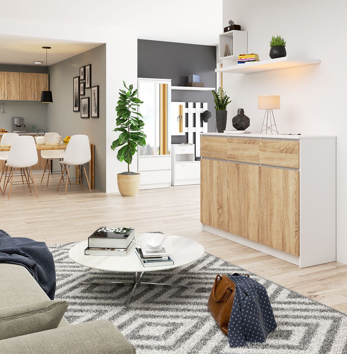 White and Sonoma Oak sideboard with 3 drawers and 3 doors. .. more