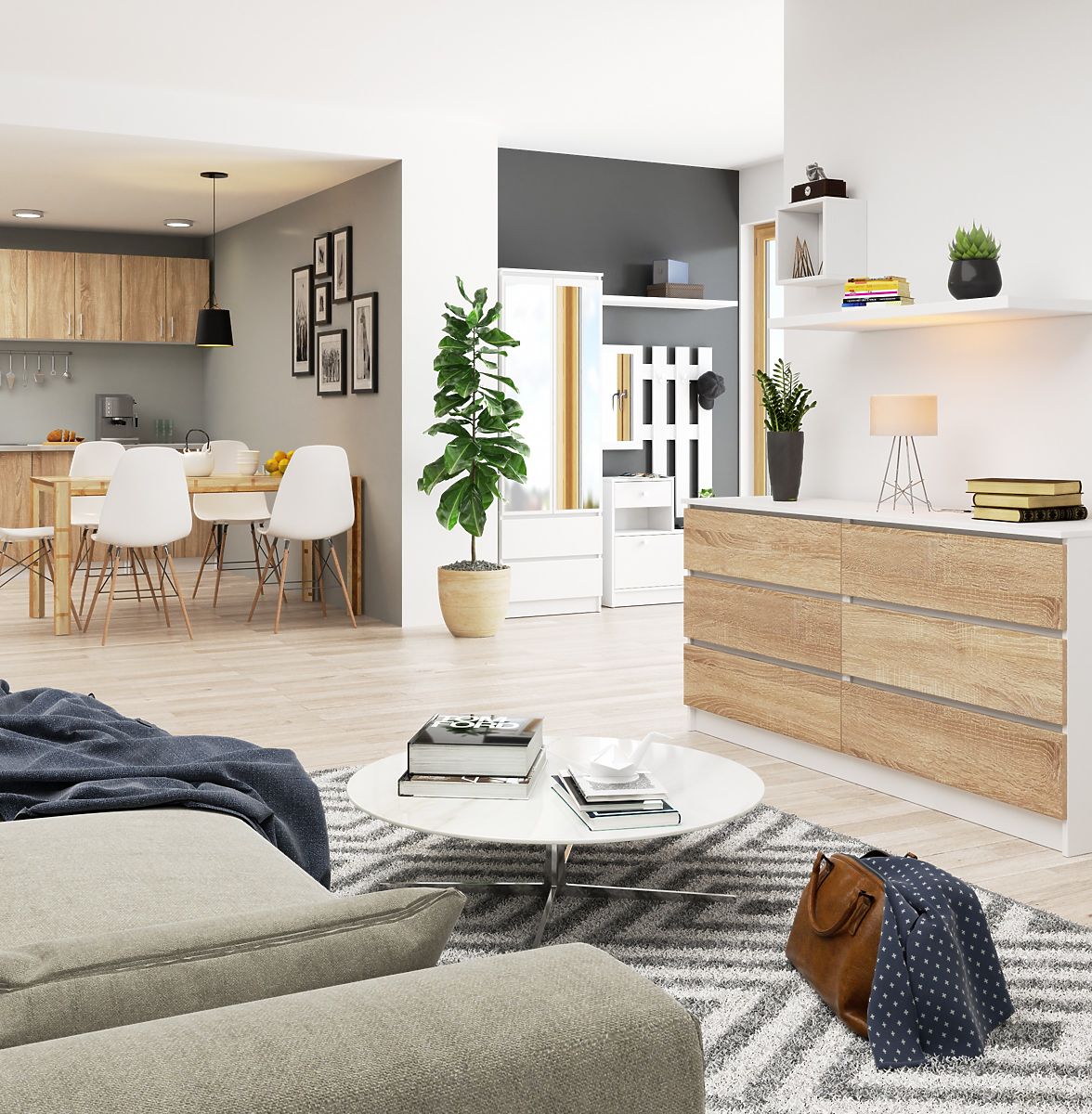 Make the best use of your living room space while arranging it aesthetically. Our store's chest of drawers in white/sonoma color will help you with that. It is made from high-quality laminated board, which is also abrasion-resistant. Additionally, the chest is equipped with ABS edges to ensure protection against damage.