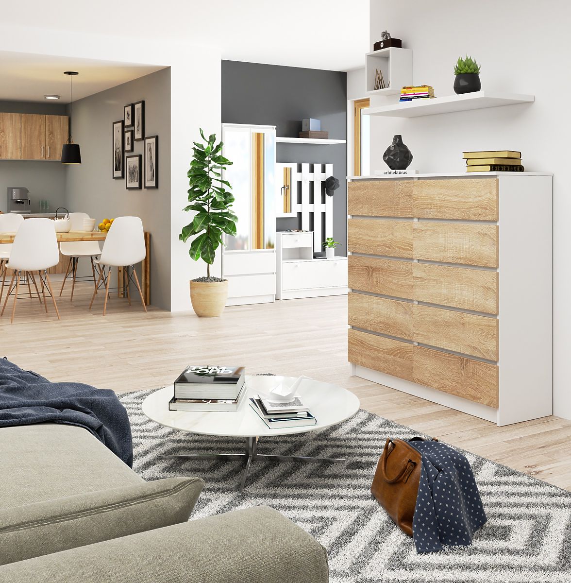 Chests of drawers are functional furniture, essential for organizing textiles and other items. Sometimes there are really a lot of them. In such cases, it's worth choosing the white K 120 cm chest of drawers with sonoma-colored drawer fronts - it contains up to 10 drawers, providing plenty of free space for use. Best placed in the living room, bedroom, or hallway.
