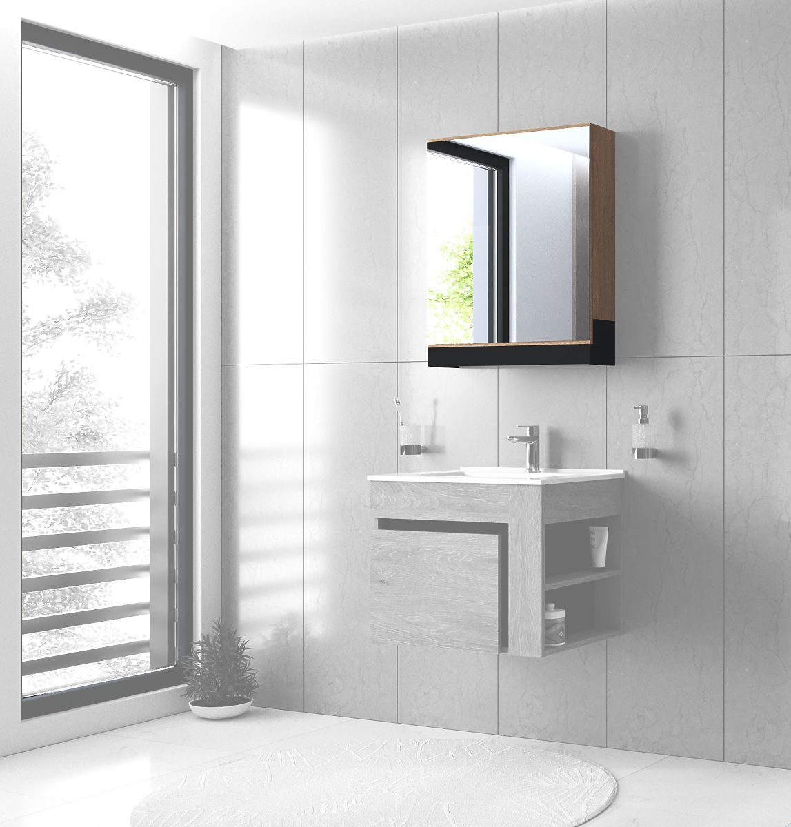 Mirror cabinet with soft close in golden oak and black. .. more