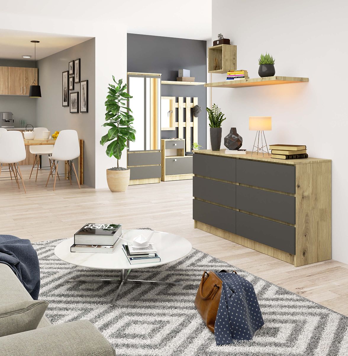 Six-drawer sideboard in Oak Artisan and Graphite Gray. .. more