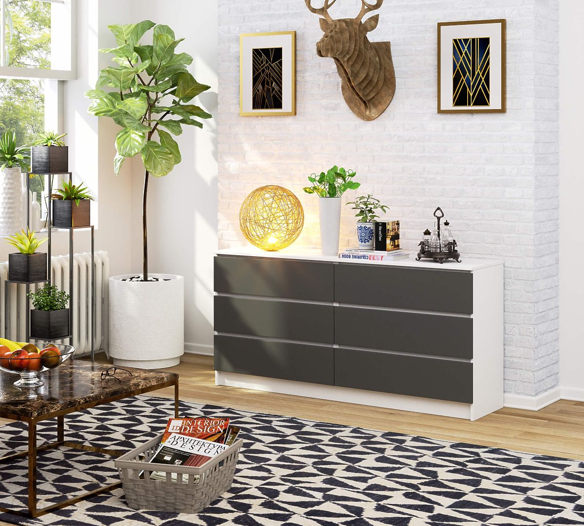 The chest of drawers is a piece of furniture so versatile that it can be used in any room. It most commonly appears in living rooms, children's rooms, bedrooms, dining rooms, or offices. The chest of drawers should match the other furniture in the arrangement and be characterized by solid and careful craftsmanship and functionality. The presented product K 160 cm is a modern model maintained in a timeless tone. The combination of white and graphite gray will undoubtedly appeal to those who prefer a minimalist style and interiors furnished in a Scandinavian style. The chest of drawers is equipped with six spacious drawers. It opens and closes easily. It will find use in both residential and office spaces.