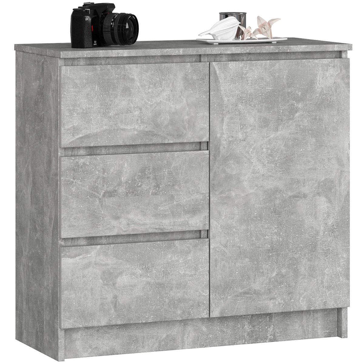 The small chest of drawers is an element of equipment that will find use in any room. Modern colors, solid construction, and careful craftsmanship have led to the creation of a cabinet that will prove useful, for example, in the hallway, living room, or student room, as well as in the bedroom. It can also be used in office spaces, where it allows for the storage of many documents and other office supplies. The chest of drawers consists of one door (with two shelves inside) and 3 drawers. The furniture combines a concrete color scheme.