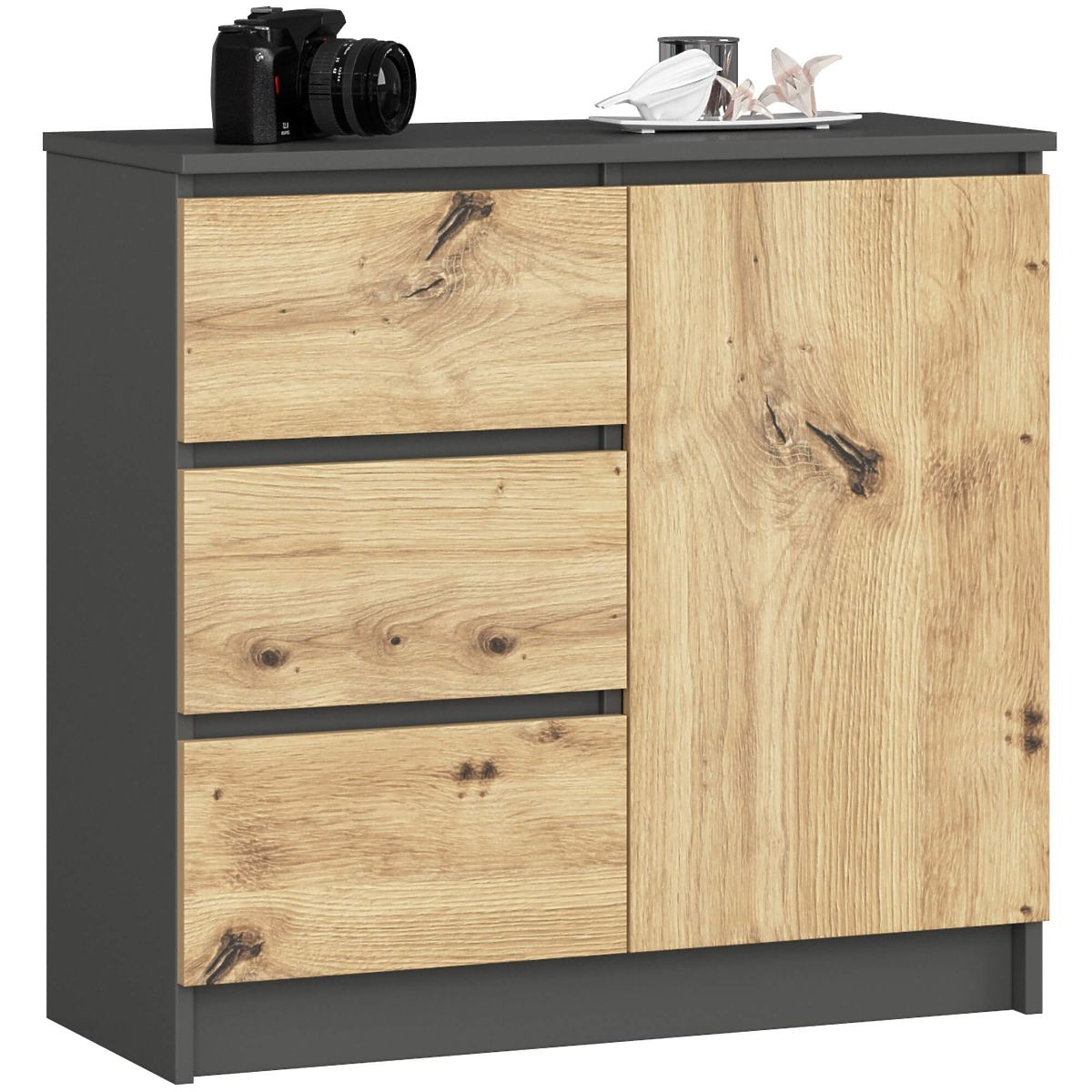 This small chest of drawers is a versatile piece that can be used in any room. Its modern colors, sturdy construction, and meticulous craftsmanship make it suitable for hallways, living rooms, children's rooms, and bedrooms. It can also be used in office spaces to store documents and other office supplies. The chest consists of one door (with two shelves inside) and 3 drawers. The furniture combines graphite gray and artisan oak colors.