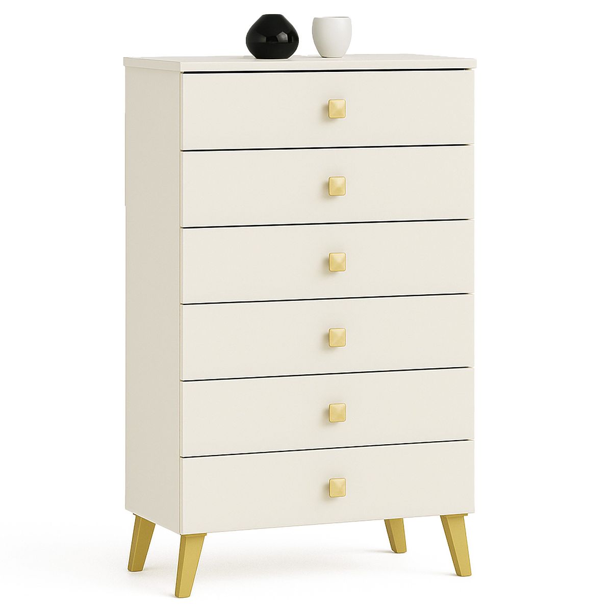 This small chest of drawers is a piece of furniture that will find use in any room. Modern colors, solid construction, and careful craftsmanship have led to the creation of a cabinet that will prove useful in the hallway, living room, student room, and even the bedroom. It can also be used in an office space, allowing for the storage of many documents and other office supplies. The chest consists of 6 drawers. The furniture combines cashmere and gold colors.
