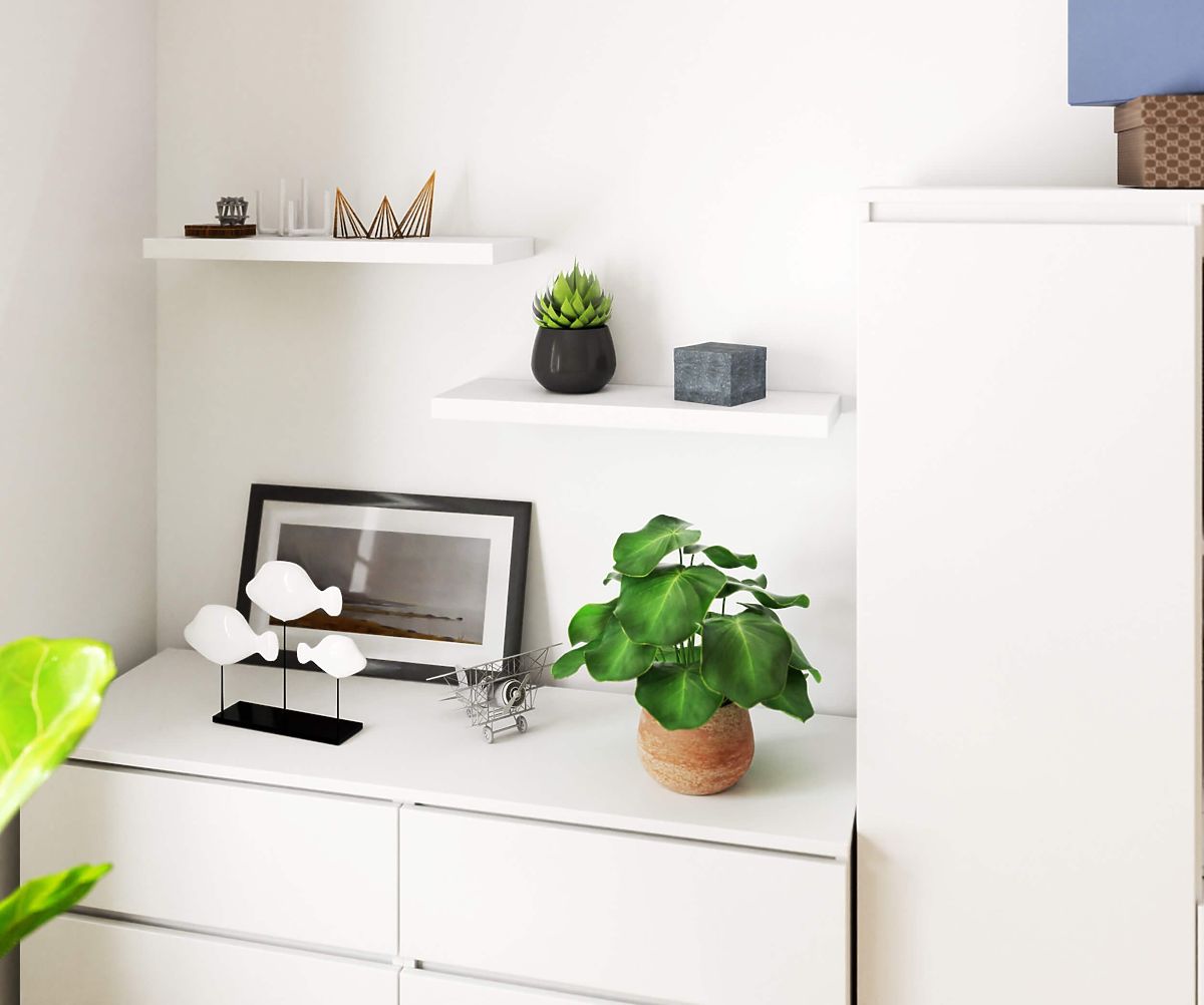 The shelf is made of laminated board, characterized by abrasion resistance. The solid construction and installation using invisible wall mounts ensure that the product is stable and holds well on the wall.