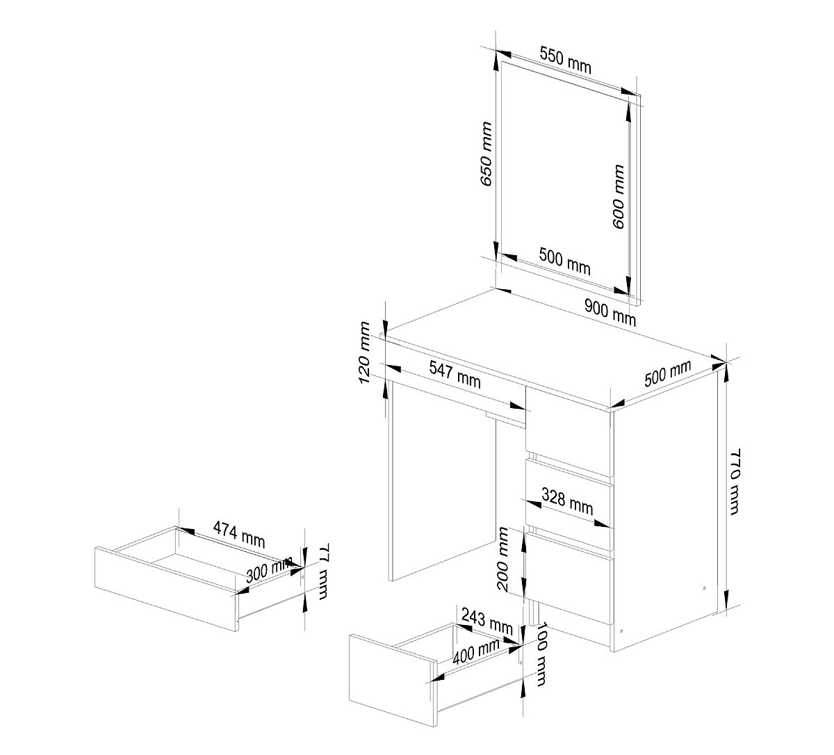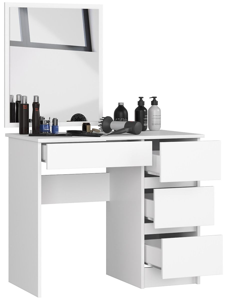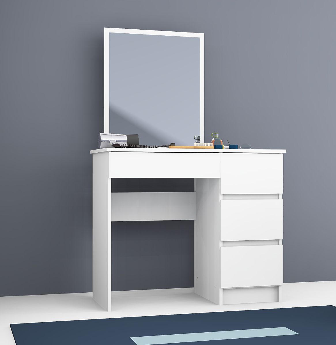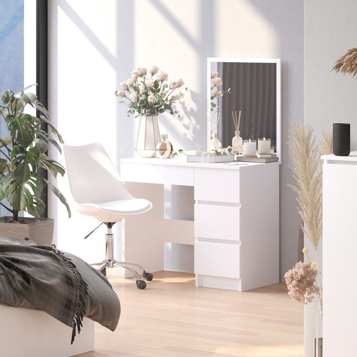 Having a vanity table is a dream for many women. Creating a beauty corner has more advantages than it might seem. Firstly, a vanity table is a way to highly practically utilize free space. Additionally, it allows for defining a specific care zone and facilitates maintaining order in the home. The vanity table significantly eases care activities not only for the happy owner but also for other household members who simultaneously use the bathroom. An ideal vanity table should be both practical and aesthetic. We recommend choosing a vanity table with a mirror from our offer. The white color allows for easy adaptation to many arrangements. The vanity table can serve a dual function - during the day it can easily transform into a work or study space, allowing for further savings of valuable space. The vanity table fits both in the bedroom and in the room of any teenage girl, as well as a younger girl who will surely be delighted with such a decorative element in her room.
