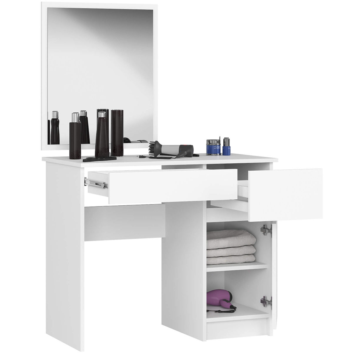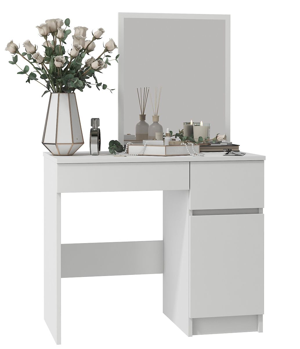 Vanity table with mirror in a white shade featuring drawers and spacious area behind the door. 240