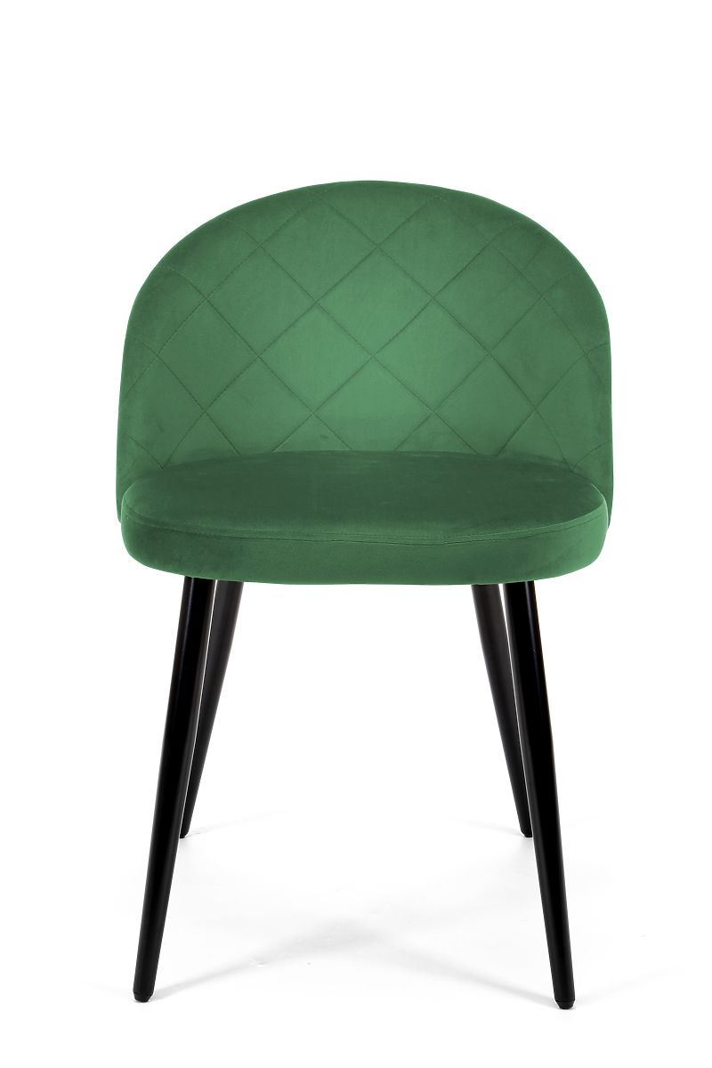 The set of velvet chairs finds many uses in modern arrangements. They are perfect as dining chairs, office chairs, or even for beauty or hair salons. The product has upholstery made of soft velvet fabric, a rounded backrest adorned with quilted stitching, and metal legs in black color.