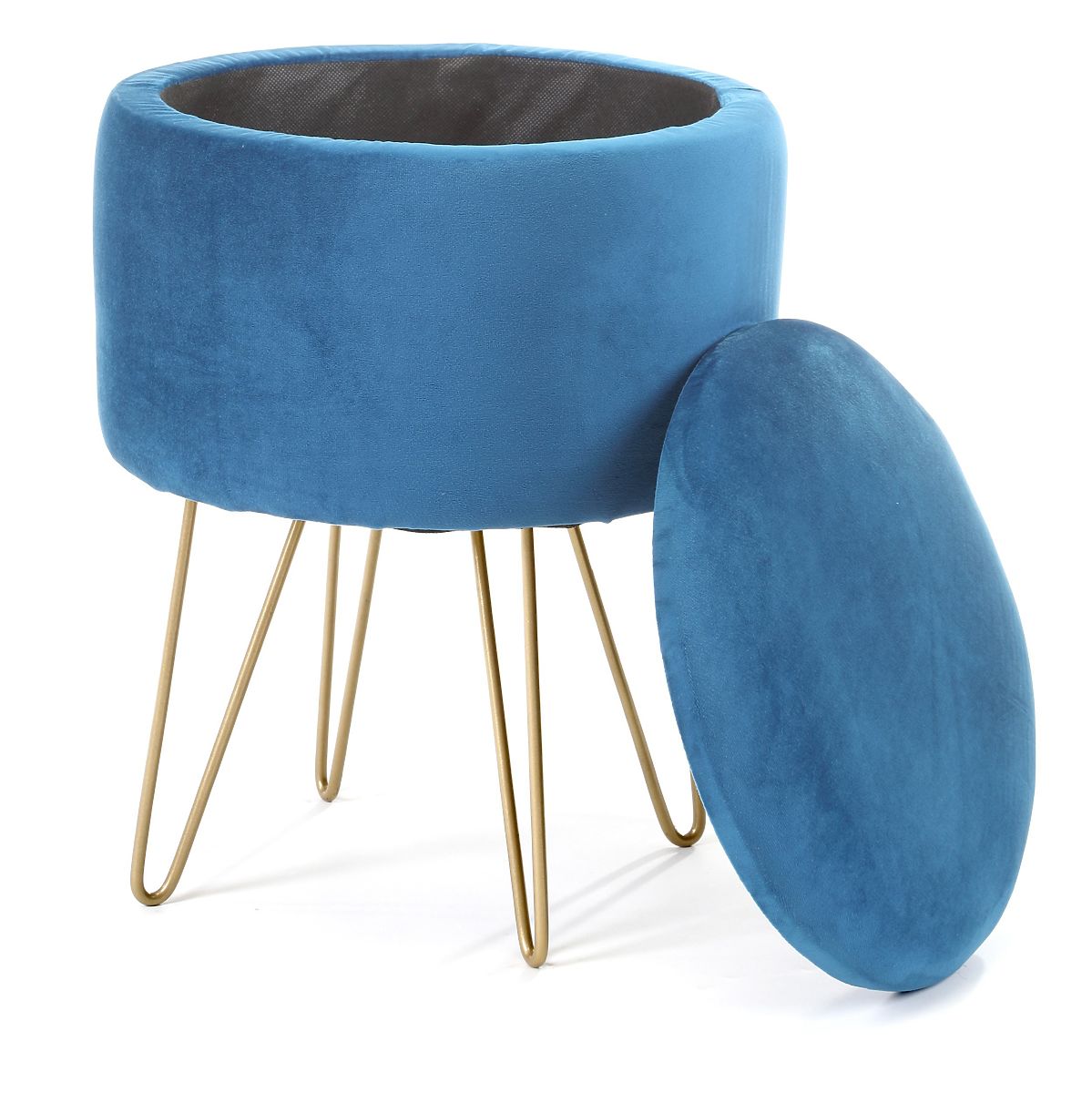 Blue pouf with storage and gold metal legs. .. more