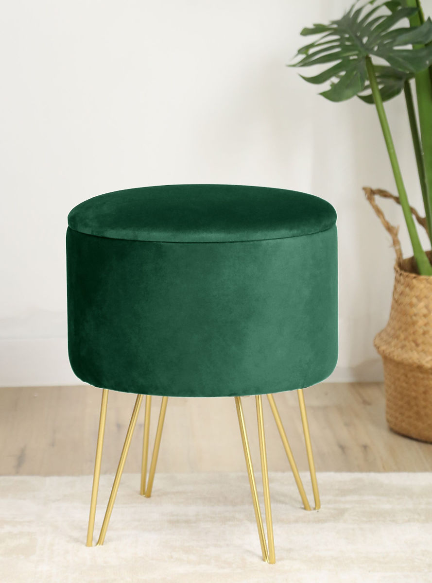 The footstool or pouf is a great addition to the living room or bedroom. It allows tired feet to rest after a long day of walking, and when the pouf is made of soft velour, it enhances the pleasant feeling of relaxation. The modern look is complemented by metal legs painted in a golden color, which is so fashionable this year. The opening lid provides access to storage space where we can store items we don't need daily.