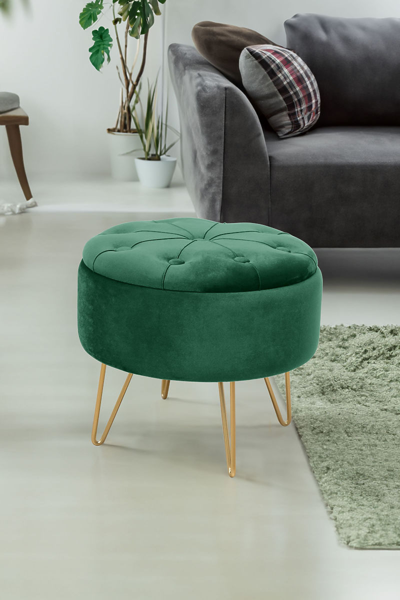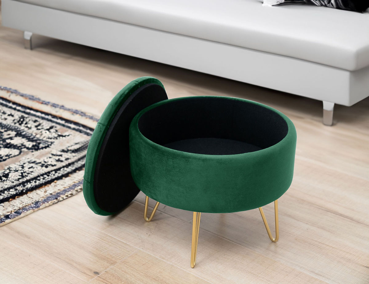 The footstool or pouf is a great addition to the living room or bedroom. It allows tired feet to rest after a day of walking, and if the pouf is made of soft velour, it enhances the pleasant feeling of relaxation. The modern look is complemented by metal legs painted in a golden color, which is so fashionable this year. The opening lid provides access to the storage space, where items not needed for everyday use can be stored.Specifications: