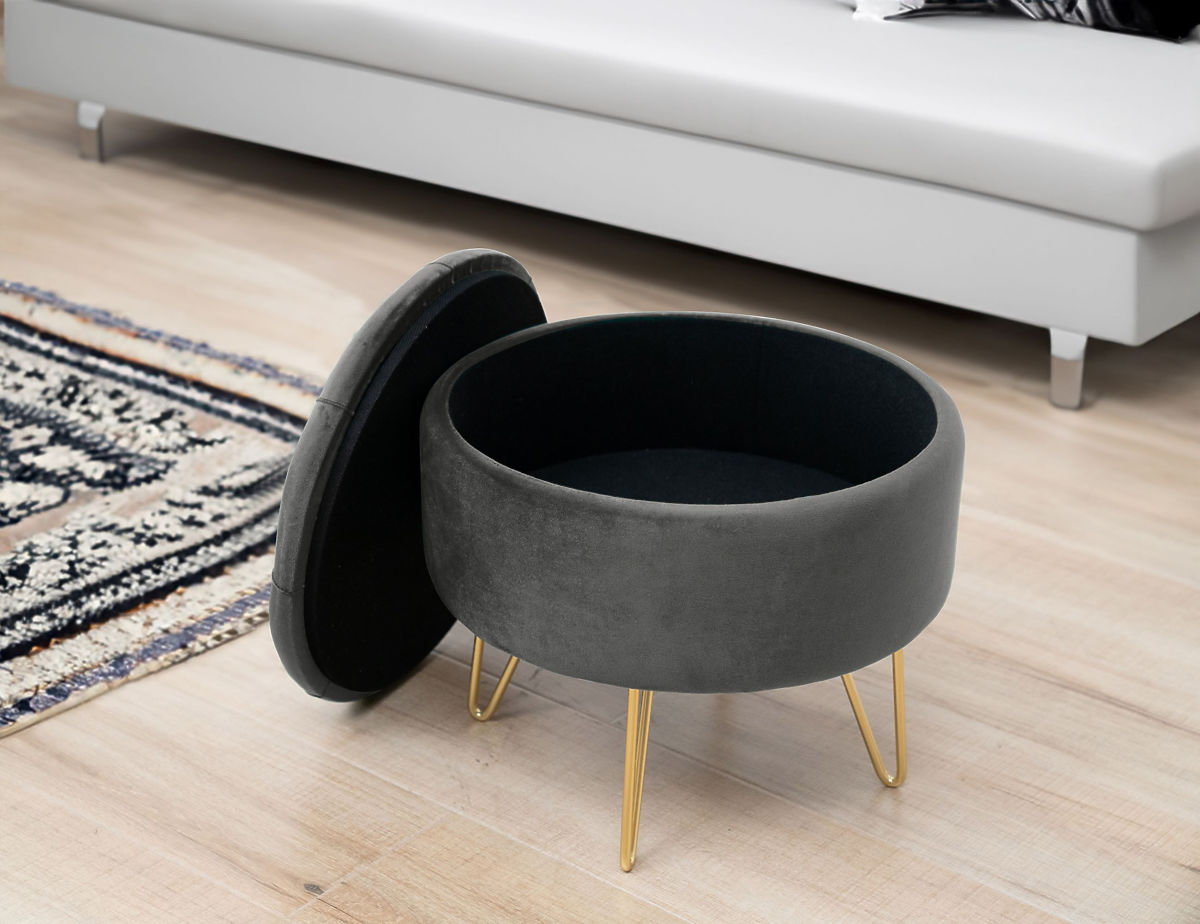 A footstool or ottoman is a great addition to a living room or bedroom. It allows tired feet to rest after a long day of walking, and when the ottoman is made of soft velour, it enhances the pleasant feeling of relaxation. The modern look is complemented by metal legs painted in a golden color, which is so fashionable this year. The opening lid provides access to the storage space where items not needed for everyday use can be stored.Specifications: