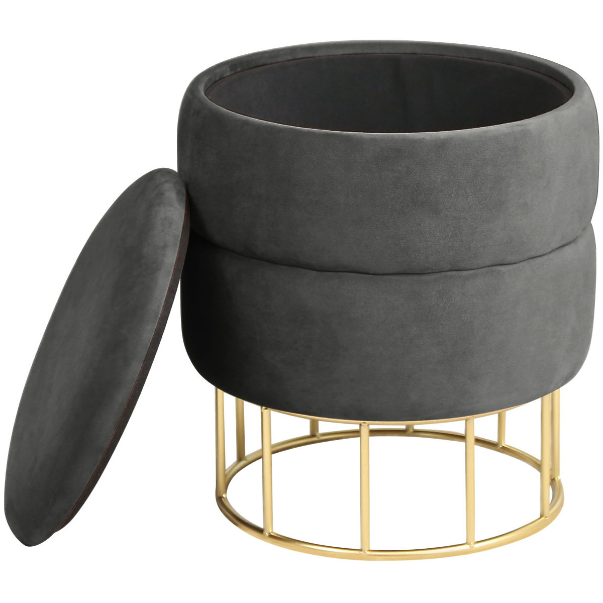 Graphite gray pouf with gold metal base and storage space. .. more