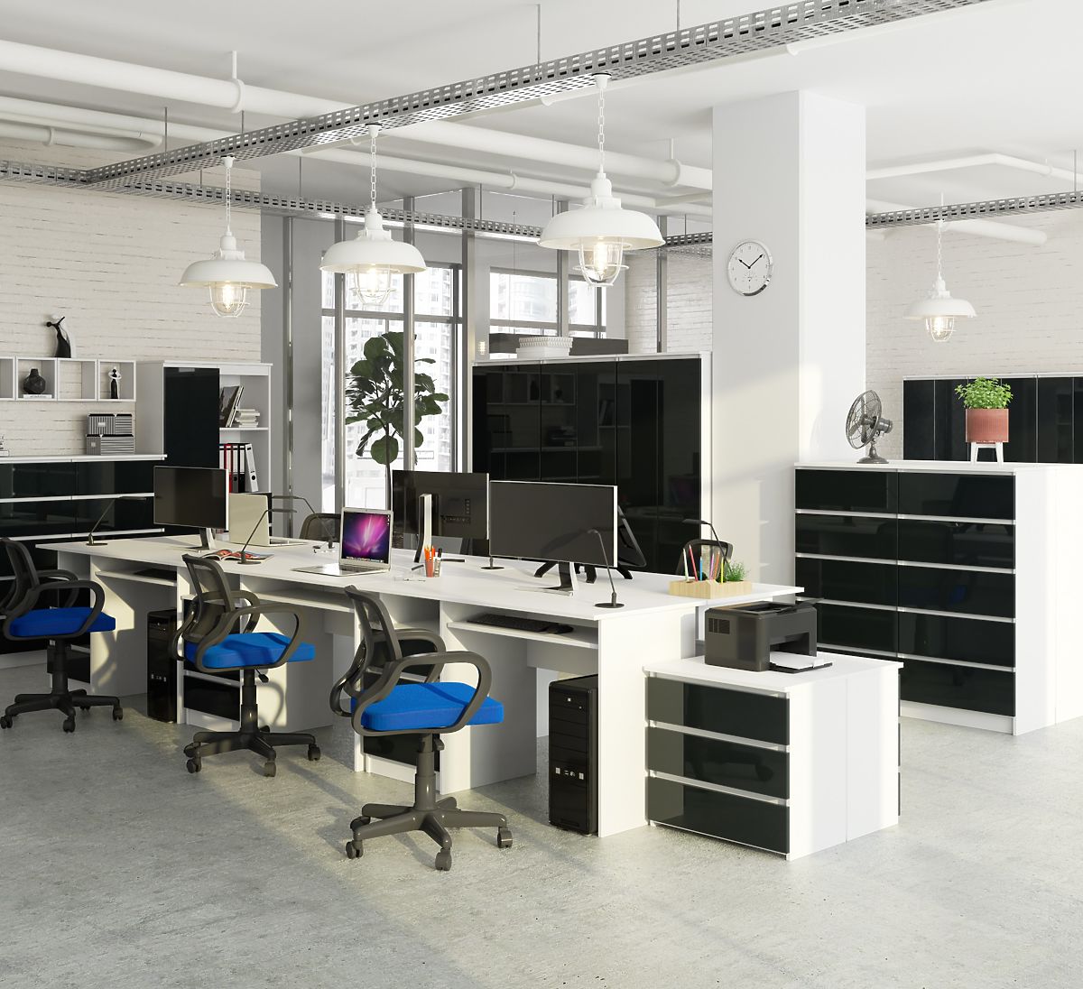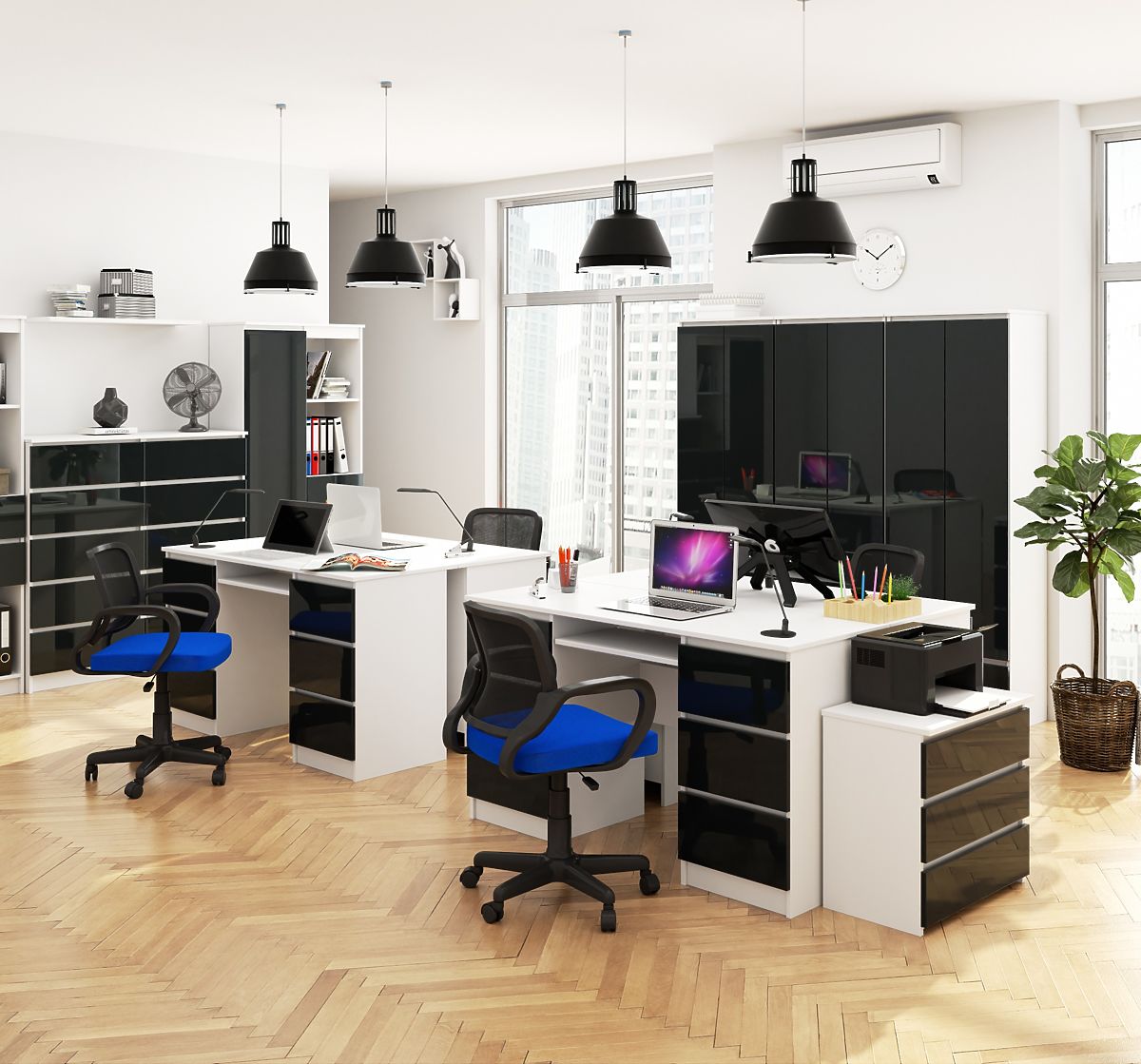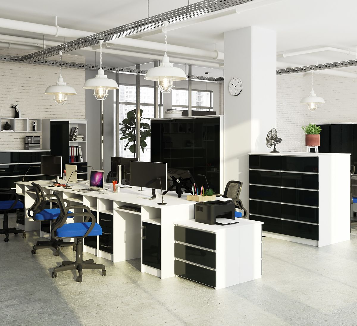 The white office shelf with high-gloss graphite fronts is a new offering within the CLP Furniture System. The furniture is made from a board covered with laminate from Kronospan, showing abrasion resistance, while the front is made from acrylic MDF board of the highest gloss standard. The high quality of workmanship is visible in every detail - the edges are finished with ABS edging to ensure durability and resistance to damage. Depending on preferences, the door can be mounted on the right or left side. The shelf has a total of 8 shelves, half of which are covered, allowing for discreet storage of personal items. The open shelves are ideal for placing books or displaying colorful accessories. The minimalist style of the shelf fits well into both modern office interiors and homes decorated in a Scandinavian style. White adds lightness and elegance, while glossy graphite adds character. It's an offer for those who value simple and modern forms.