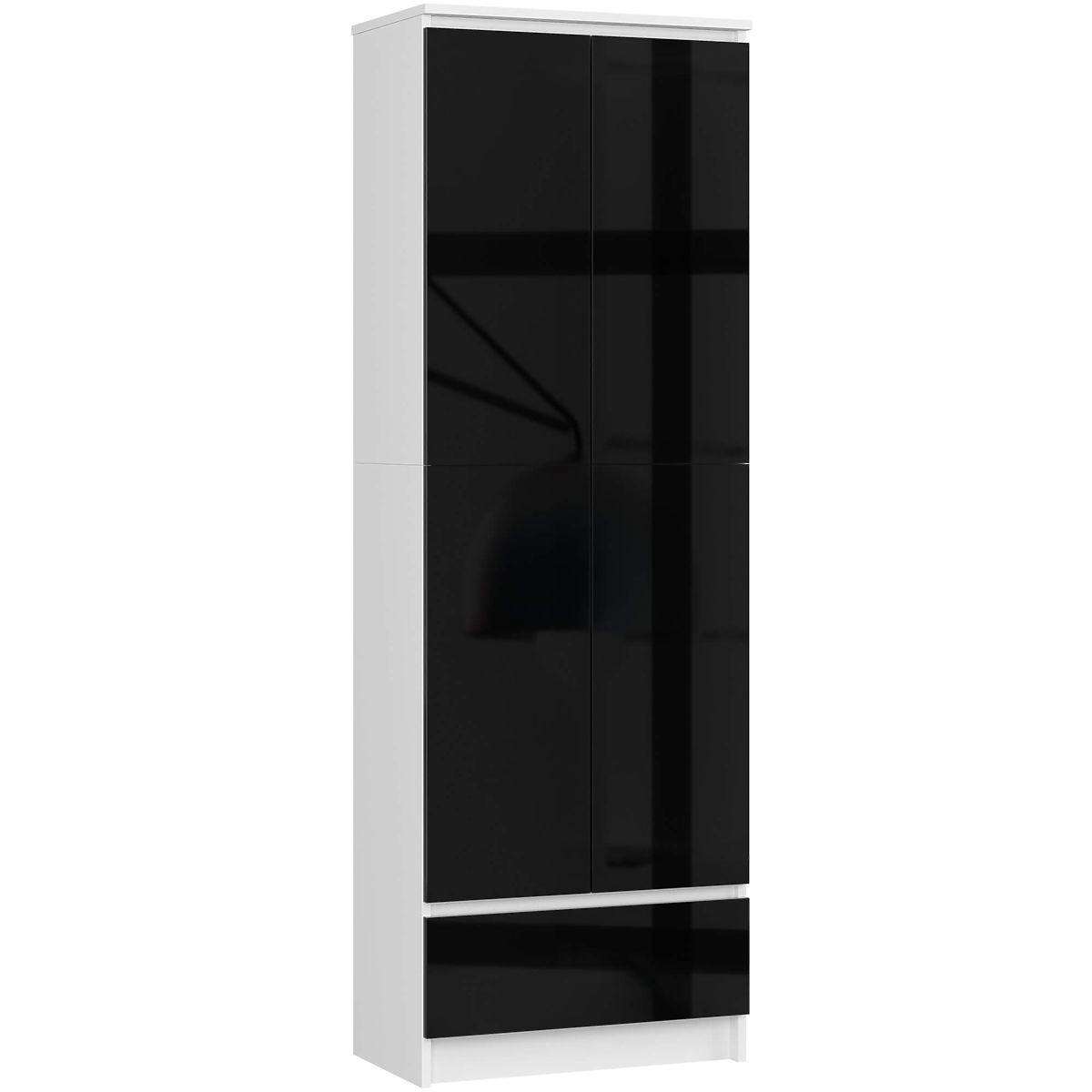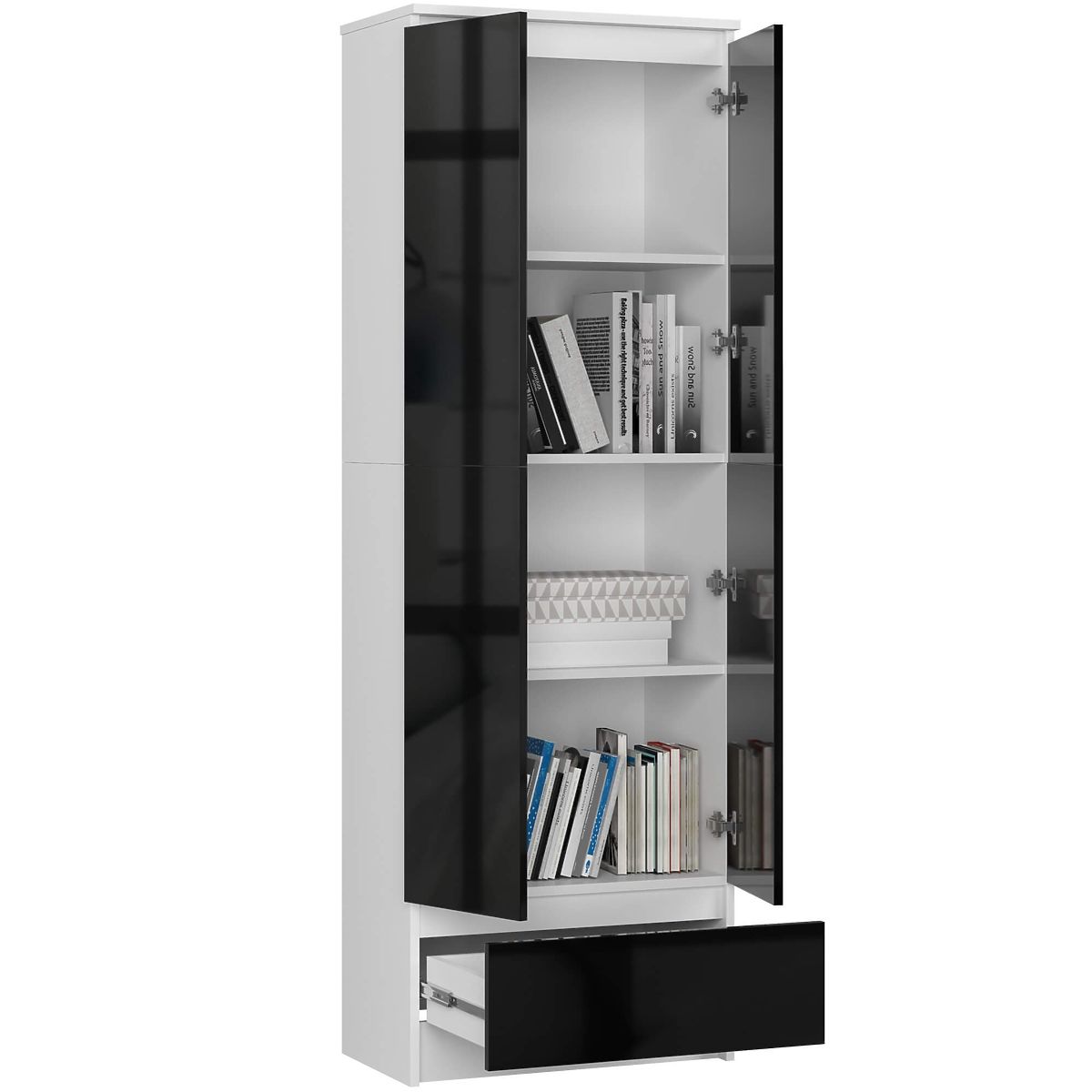 The CLOSED SHELF CLP with a width of 60 centimeters is designed for those seeking a functional and stylish solution for their office or apartment. The furniture consists of a drawer and an opening section with shelves. The white body of the shelf combines excellently with the black, glossy fronts. The furniture is made from 16mm abrasion-resistant laminated board. The edges are finished with ABS edging. The whole unit features a very sturdy construction and modern design. The offer is available in our online store at an attractive price. Four spacious shelves behind the doors will surely accommodate all necessary items in rooms such as an office, home study, living room, or student room. The furniture is also suitable for a guest room or bedroom. The durable and robust construction of the shelf deserves attention. This ensures that it is a purchase for many years. The upper and lower doors are joined into one unit and cannot be opened separately.