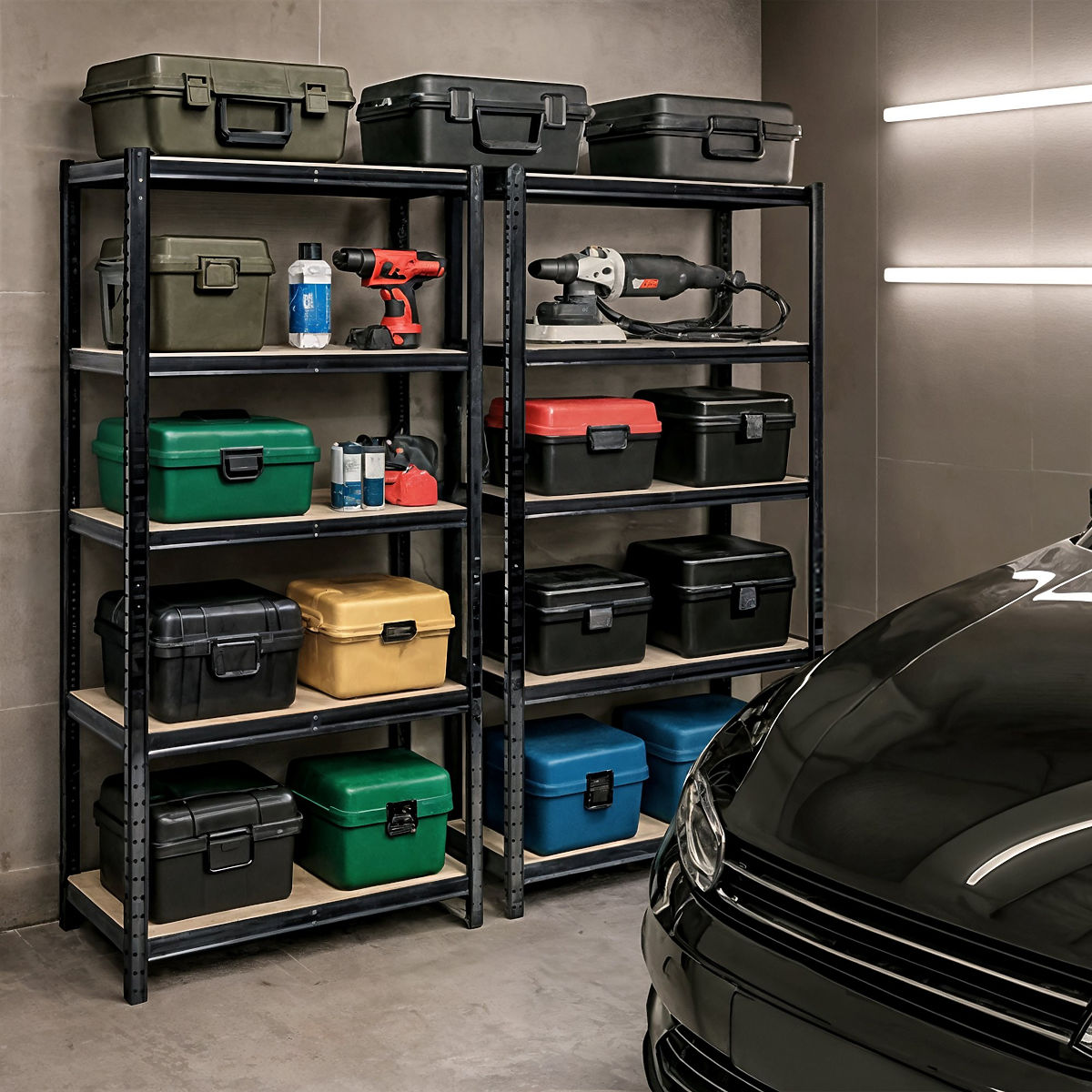 Metal shelf ideal for storage. Suitable for garage, workshop, basement storage, and utility spaces. Black shelf with a width of 70 cm and a height of 154 cm. Shelves are made from durable MDF board. Load capacity per shelf is 175 kg.