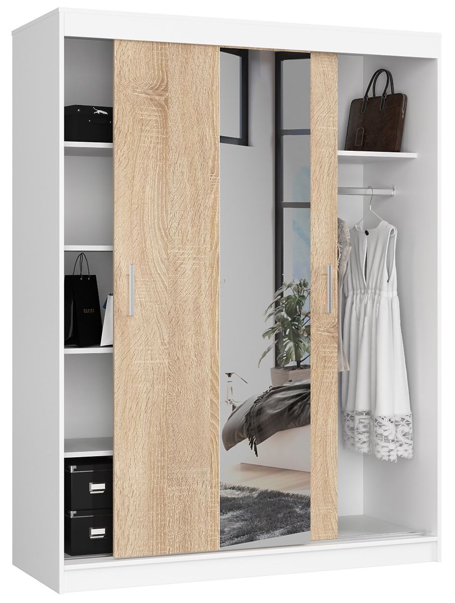 A sliding white wardrobe with doors in Sonoma oak decor, 150 cm long, featuring shelves and a clothes rail. Large area for use.