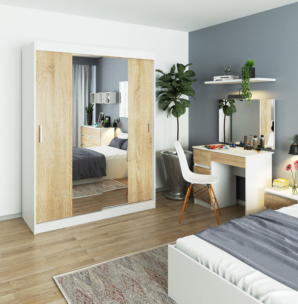 The 150 cm CLP sliding wardrobe in Sonoma shade allows us to ensure the necessary space in our bedroom or dressing room, which we can use for storing various items, not only clothes but also, for example, spare pillowcases. How we use this furniture depends on our individual needs. The wardrobe is equipped with a very practical and useful feature in the form of a mirror, which allows us to check if the chosen style is right. The furniture can also be successfully placed in the hallway, living room, or student room. The space available with this product is sufficient for two people.
