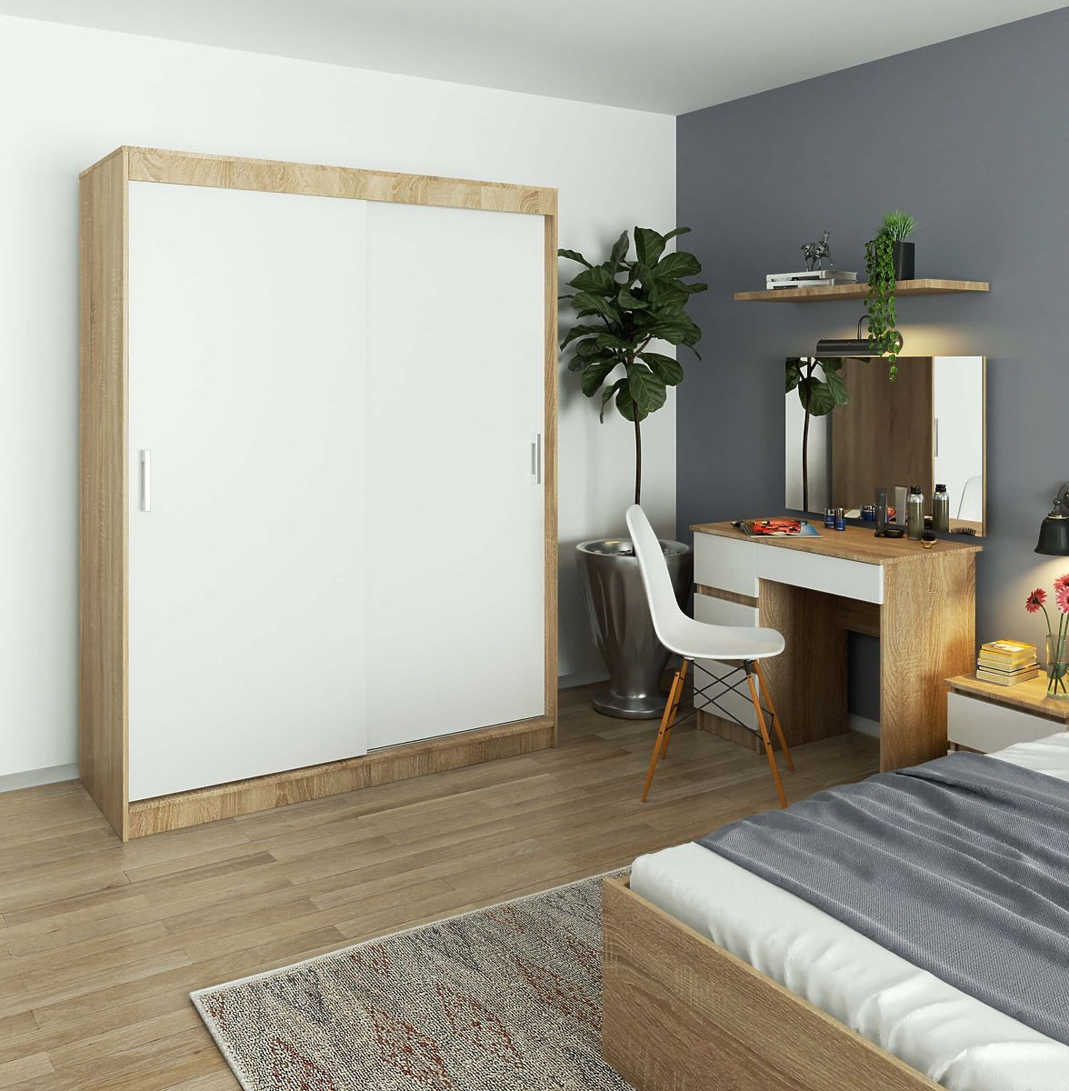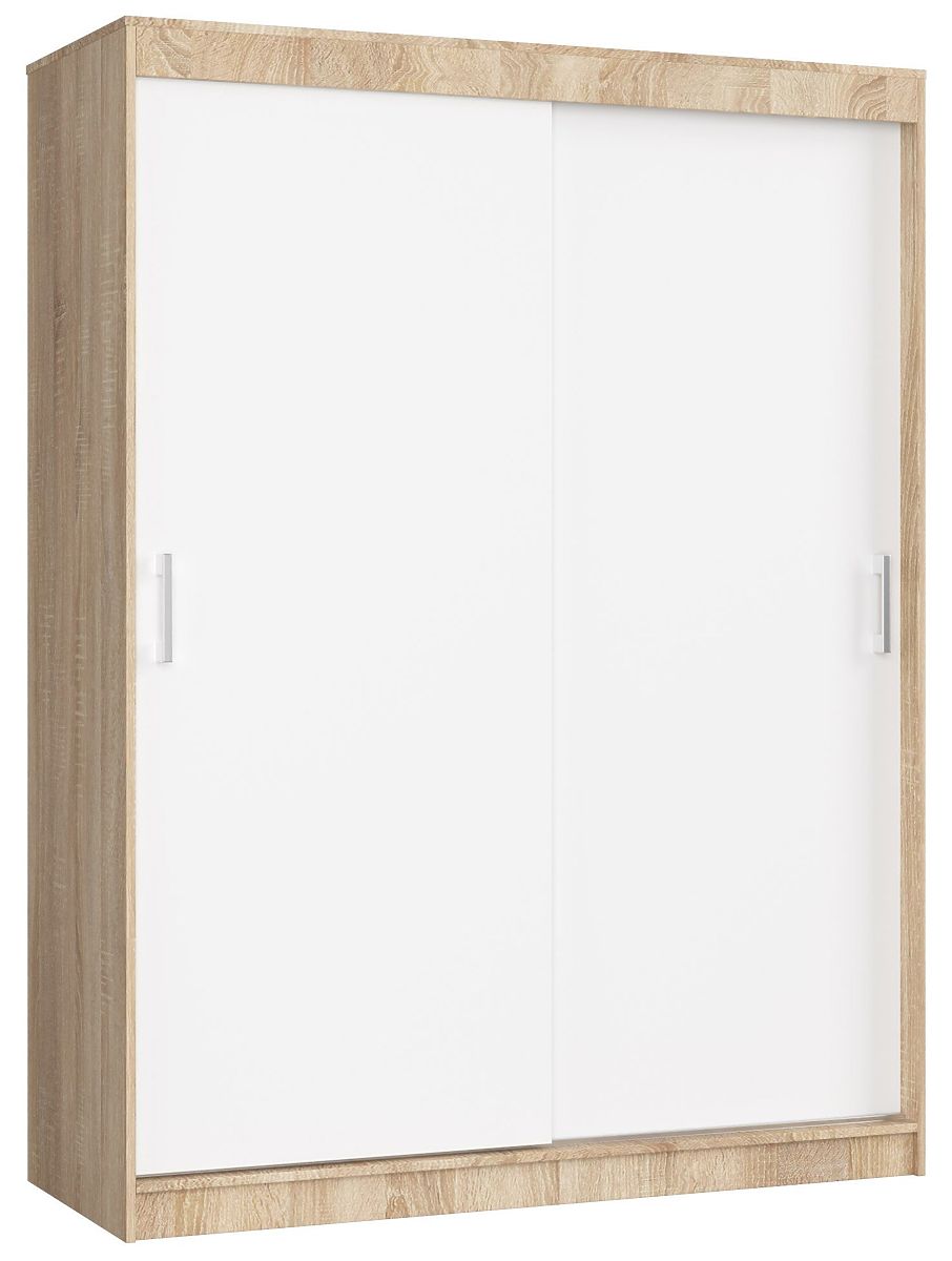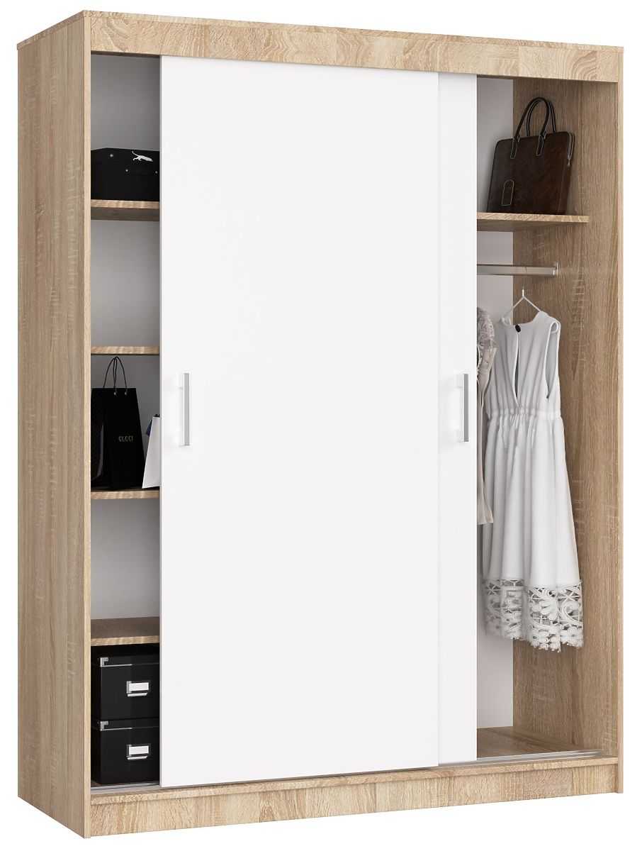 The Sliding Wardrobe 150 cm CLP MONO SONOMA/WHITE is a piece of furniture where you can comfortably place all your clothes. It will be appreciated by women who like order as well as practical men. You will find space for sweaters, blouses, t-shirts, pants, skirts, and favorite dresses. You can freely hang a longer coat, warm jacket, or suit. You can also store shoes, hats, scarves, or gloves. This spacious wardrobe will fit into rooms furnished in a modern, minimalist style. It will emphasize their character and also brighten up a poorly lit interior, such as a hallway usually is.