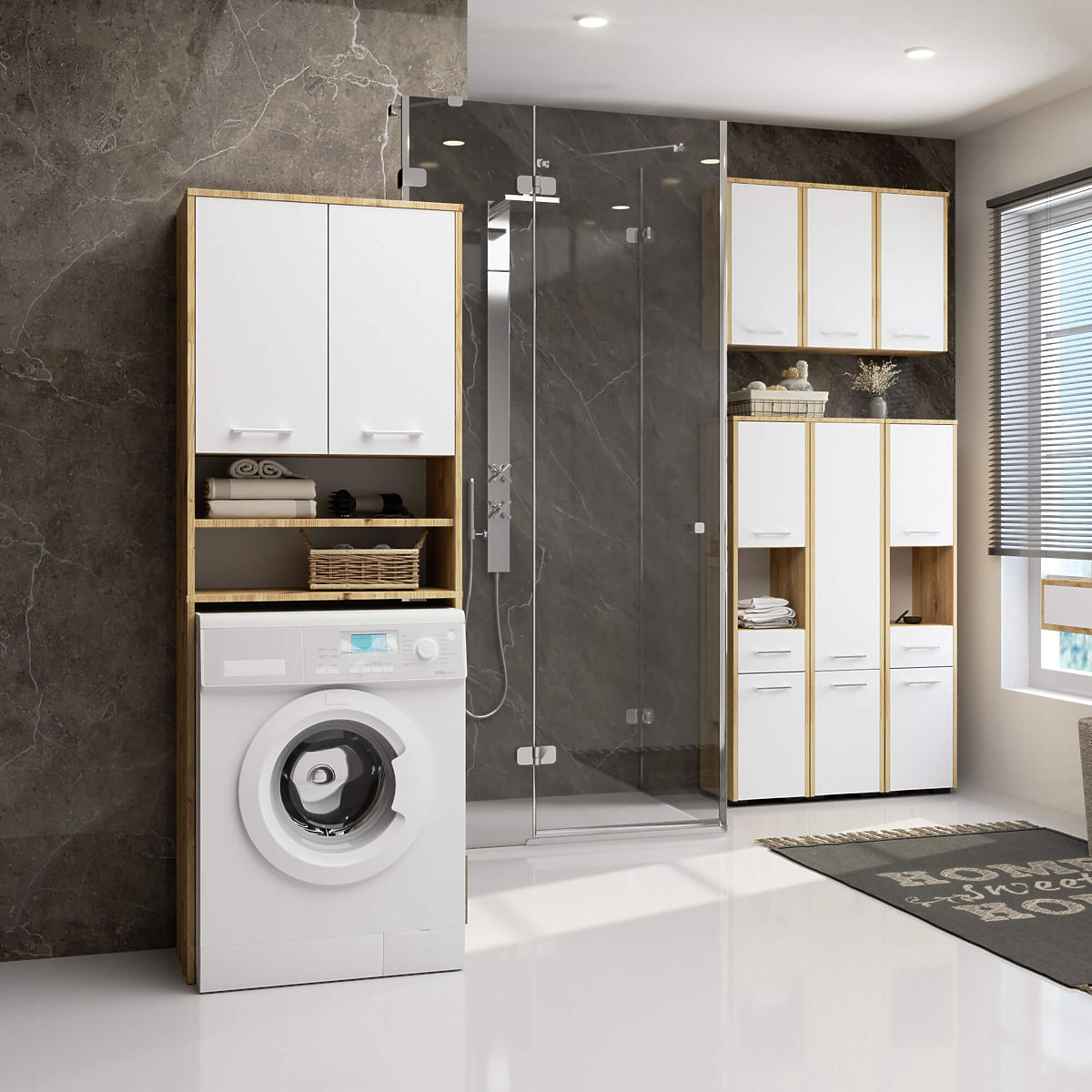 The bathroom cabinet above the washing machine is a practical and attractive design furniture. The shelf has two spacious shelves at the bottom, directly above the washing machine niche, and a large storage space at the top closed by double doors. The cabinet has universal use and facilitates perfect space utilization in the bathroom and maintaining impeccable order. The furniture can be used for towels, cleaning agents, or washing powders and softeners. The bathroom column above the washing machine is made from moisture and abrasion-resistant laminated board. The manufacturer used a durable ABS edge for careful finishing of the furniture edges. The furniture doors are equipped with comfortable and aesthetic metal handles. The bathroom shelf, combining two colors – classic white and artisan oak, easily matches any type of bathroom interior. The bathroom cabinet looks light, and therefore it presents effectively even in bathrooms with an unusually small area.