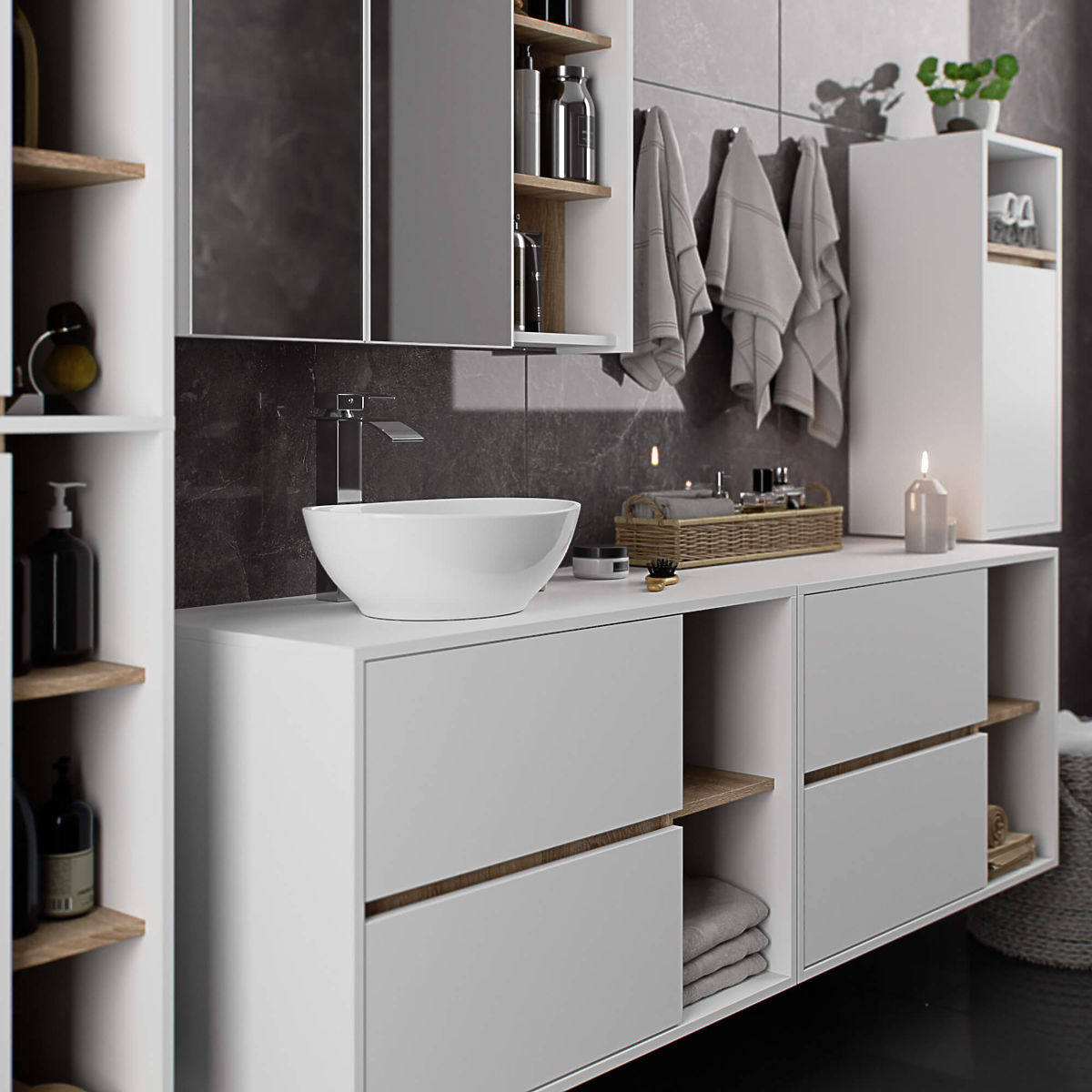 Hanging bathroom cabinet under sink 90 cm VAMI W90 perfectly fits into a modern interior. The configuration with 2 drawers and 2 open shelves offers great convenience in use. Spacious drawers can store hygiene and cosmetic products, while open shelves can hold decorations, adding a personal touch to the interior. This model of hanging cabinet under the sink has 2 holes in the board for mounting the sink and siphon. The cabinet also has specially shaped drawers that allow for the installation of the siphon and hydraulic elements. NOTE! The furniture is delivered without a sink and fittings.